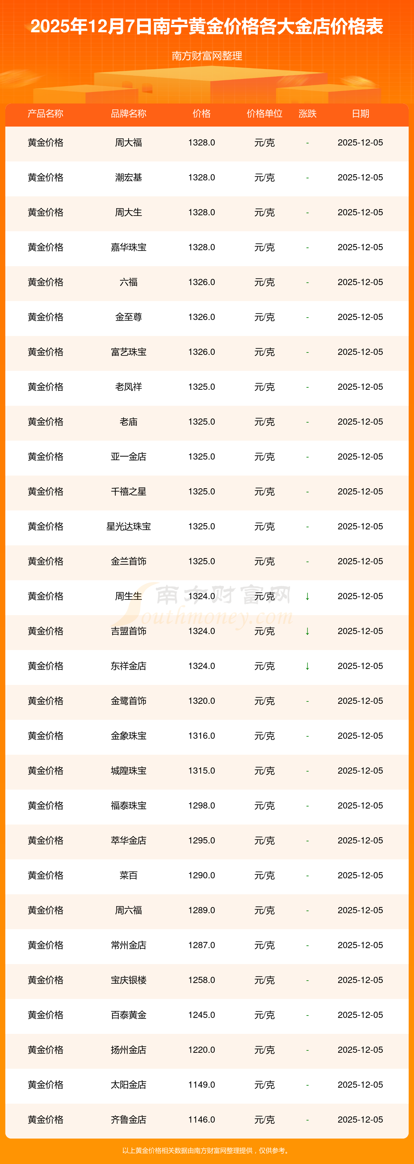 2025年12月7日,南寧周大福、周大福、周大福、周大福、周大福、周大福、周大福、老鳳祥、老鳳祥、老鳳祥、周六福等各大金店品牌黃金價格今日價格如下:周大福1328.0元/克、周大福662.0元/克、周大福1328.0元/克、周大福46550.0、周大福18970.0、周大福41990.0、周大福1165.0元/克、老鳳祥1325.0元/克、老鳳祥600.0元/克、老鳳祥1325.0元/克、周六福1289.0元/克。