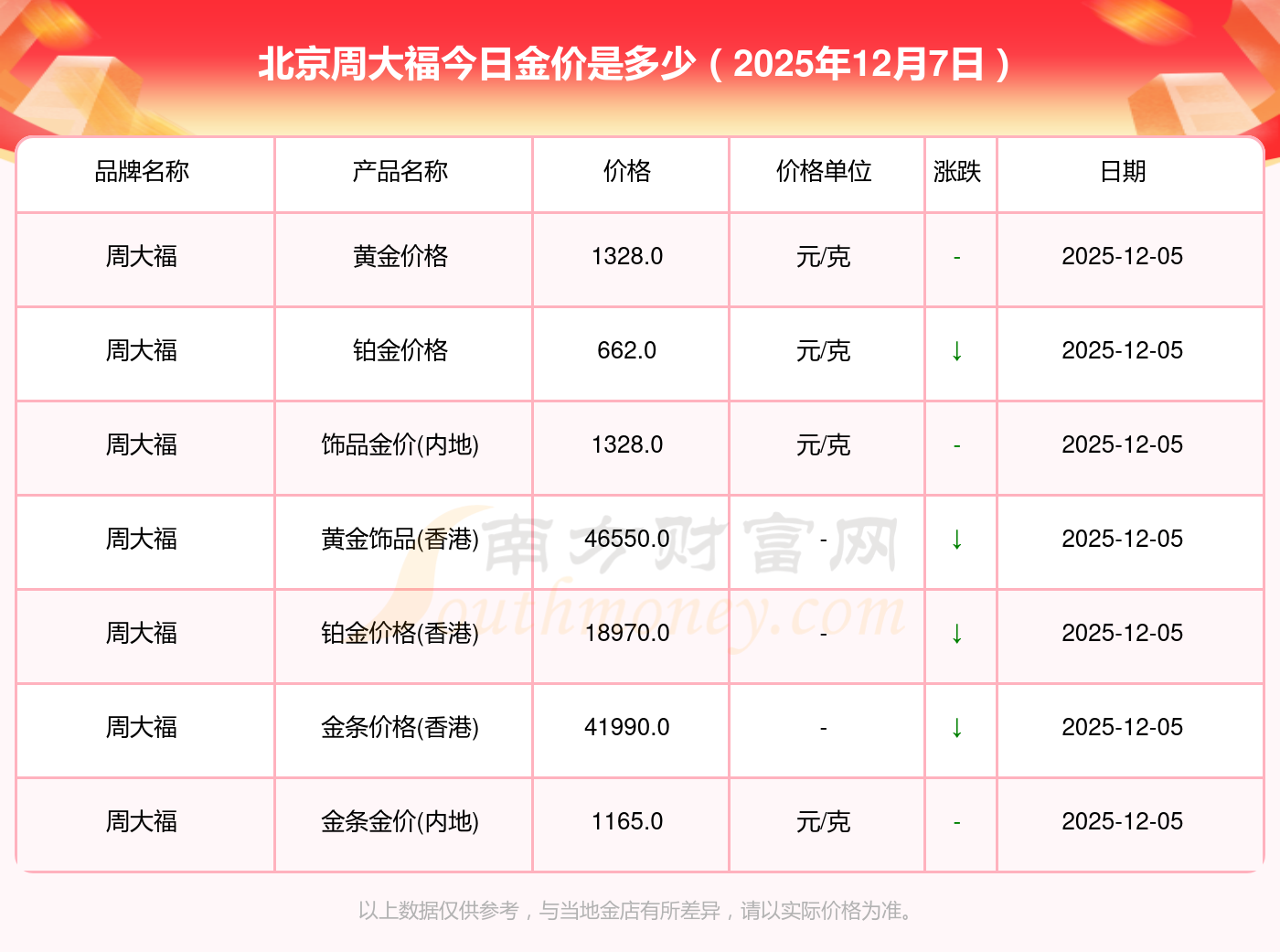 黃金價(jià)格1328.0元/克,鉑金價(jià)格662.0元/克,飾品金價(jià)(內(nèi)地)1328.0元/克,黃金飾品(香港)46550.0,鉑金價(jià)格(香港)18970.0,金條價(jià)格(香港)41990.0,金條金價(jià)(內(nèi)地)1165.0元/克,黃金價(jià)格1325.0元/克,鉑金價(jià)格600.0元/克,足金價(jià)格1325.0元/克,黃金價(jià)格1289.0元/克。