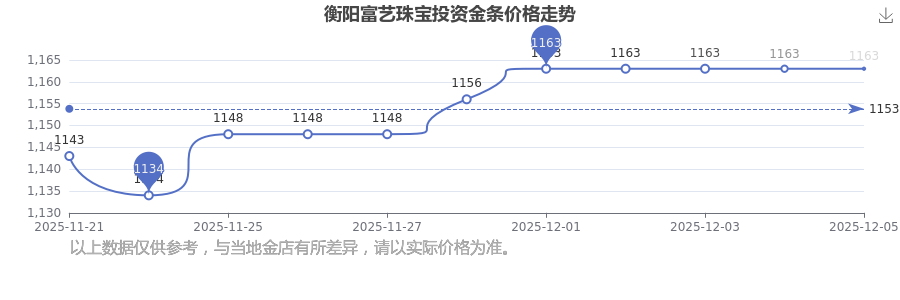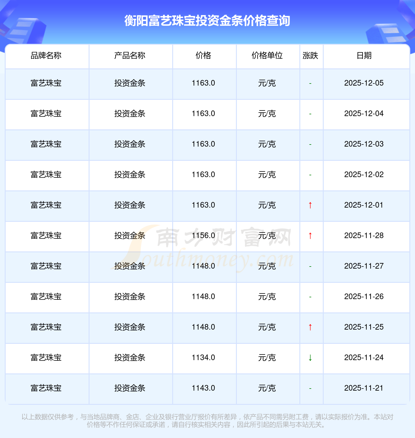 今日(2025年12月7日)衡陽富藝珠寶投資金條價(jià)格:1163.0元/克。