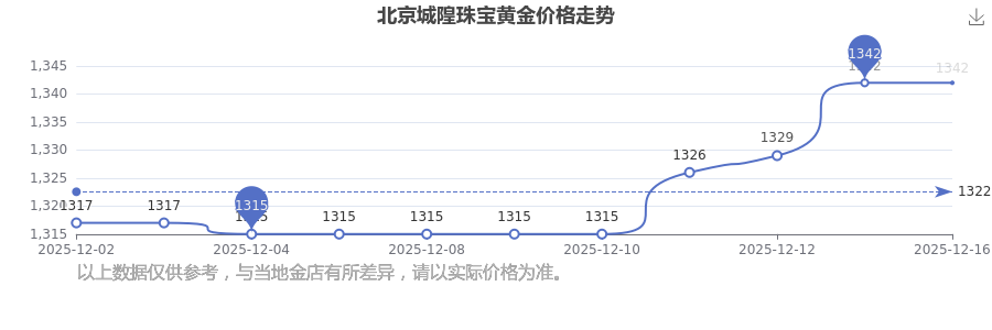 北京城隍珠寶在 2025年12月16日,黃金價格的售賣價格是 1342.0元/克。