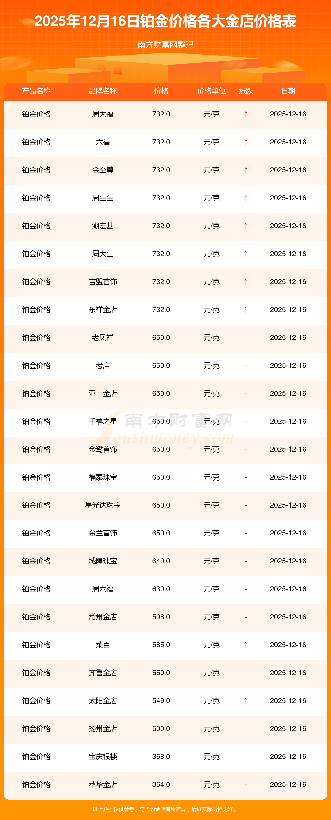 今天是2025年12月16日,周大福、老鳳祥、老廟、周生生、周大福、周大福、周大福、周大福、周大福、周大福、老鳳祥等各大金店品牌鉑金價格最新價格如下:周大福1353.0元/克、老鳳祥1349.0元/克、老廟1352.0元/克、周生生1349.0元/克、周大福732.0元/克、周大福1353.0元/克、周大福47720.0、周大福20950.0、周大福43050.0、周大福1187.0元/克、老鳳祥650.0元/克。