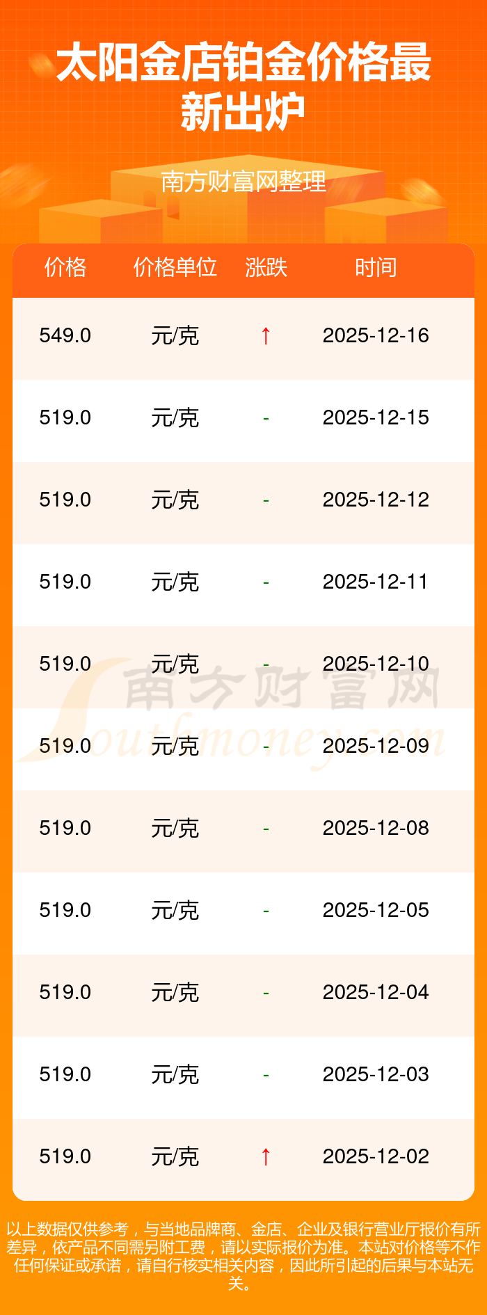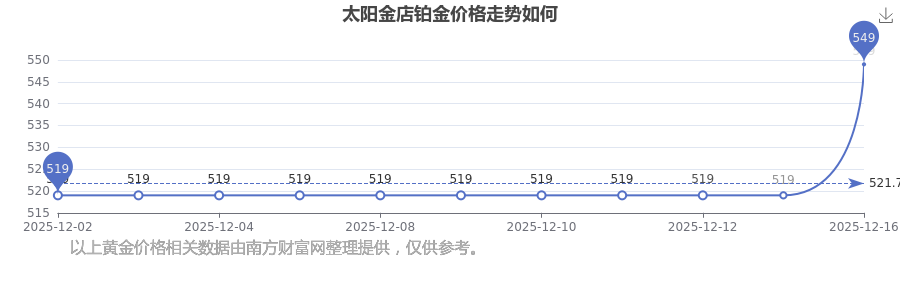 今日(2025年12月16日),太陽金店鉑金價(jià)格:549.0元/克。