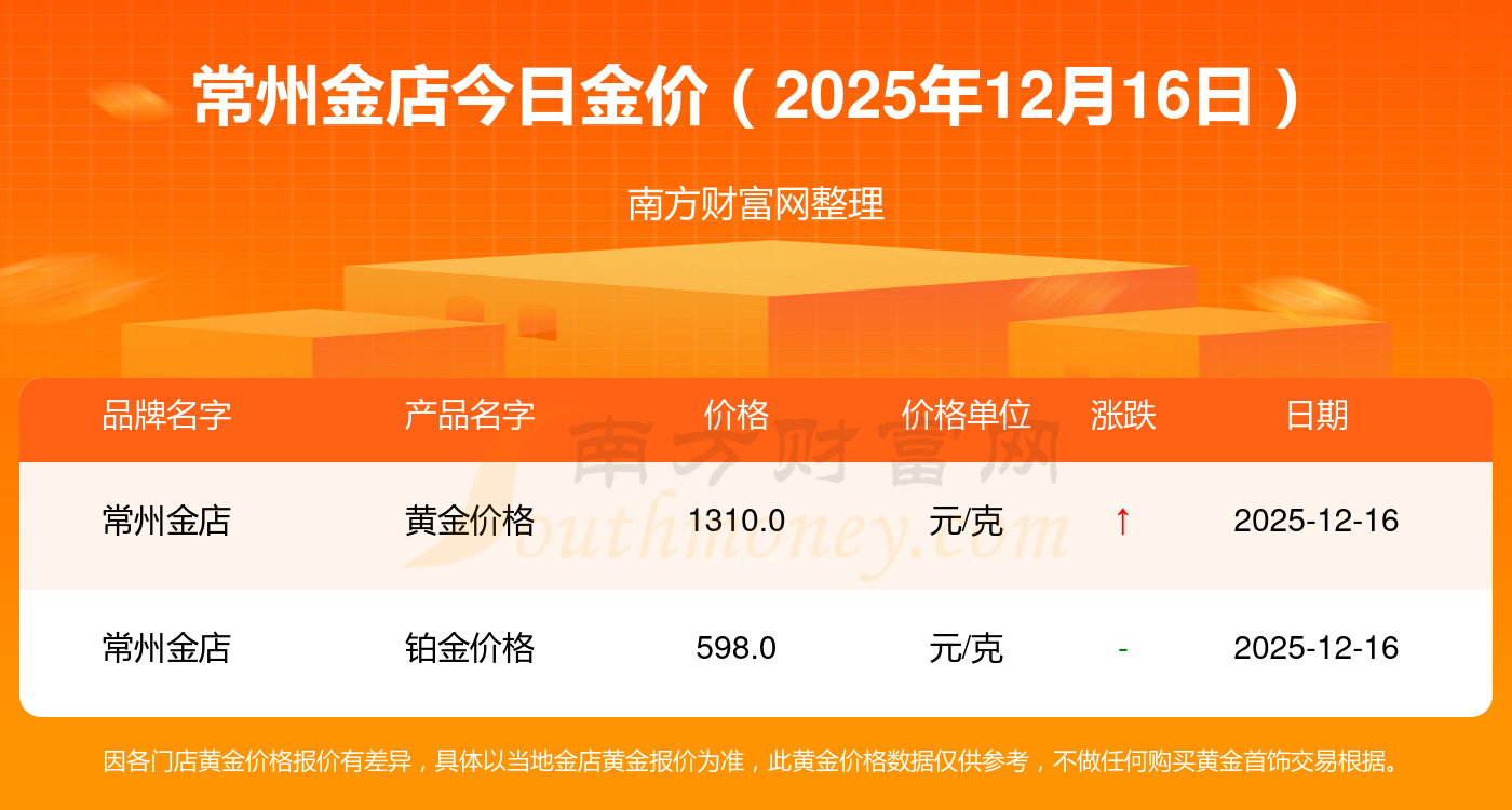 2025年12月16日常州金店金價查詢:黃金價格1353.0元/克,黃金價格1349.0元/克,黃金價格1352.0元/克,黃金價格1349.0元/克,鉑金價格732.0元/克,飾品金價(內地)1353.0元/克,黃金飾品(香港)47720.0,鉑金價格(香港)20950.0,金條價格(香港)43050.0,金條金價(內地)1187.0元/克,鉑金價格650.0元/克。