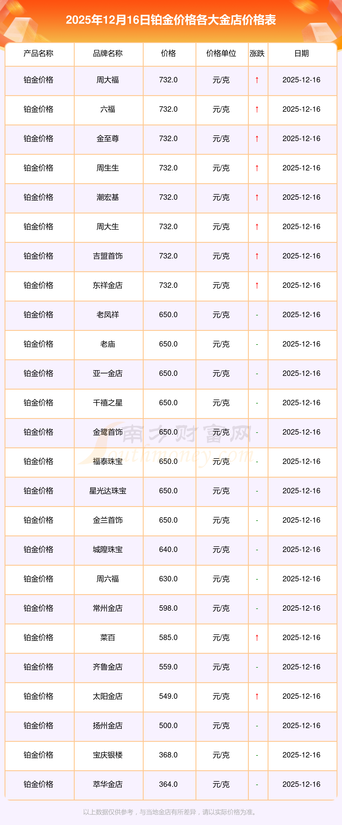2025年12月16日各大金店鉑金價格最新價格:周大福1353.0元/克,老鳳祥1349.0元/克,老廟1352.0元/克,周生生1349.0元/克,周大福732.0元/克,周大福1353.0元/克,周大福47720.0,周大福20950.0,周大福43050.0,周大福1187.0元/克,老鳳祥650.0元/克。