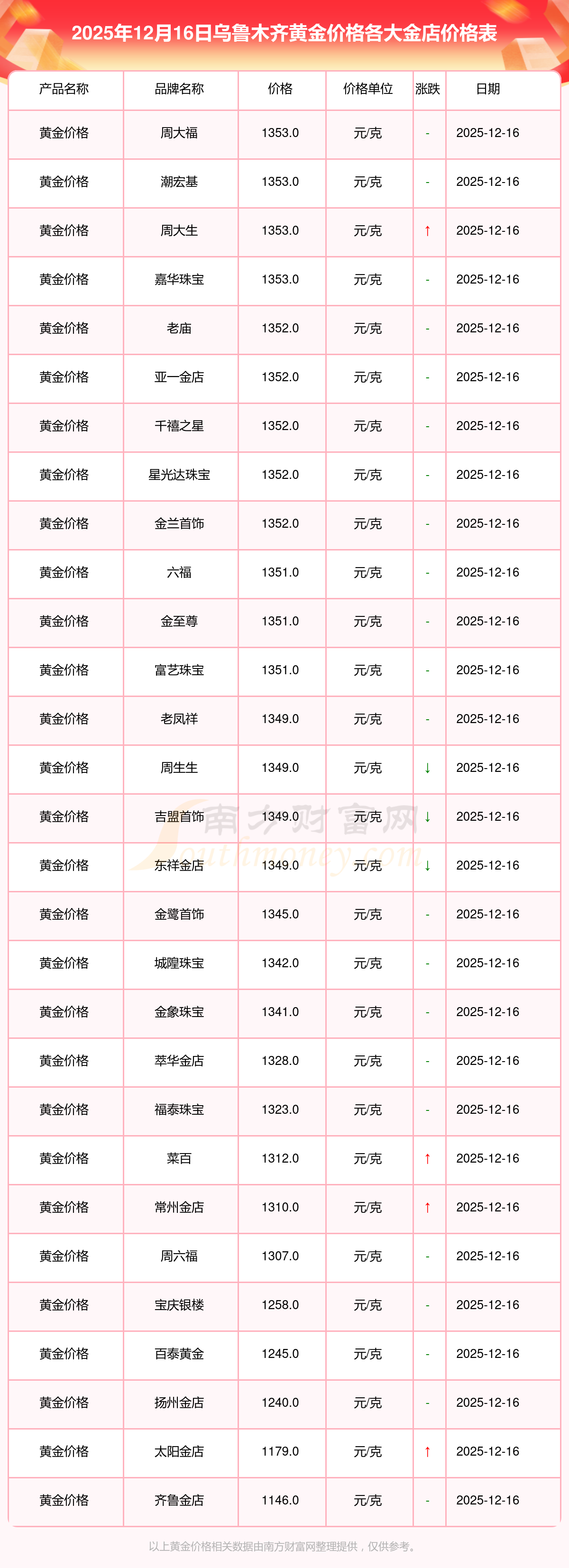 2025年12月16日,烏魯木齊周大福、老鳳祥、老廟、周生生、周大福、周大福、周大福、周大福、周大福、周大福、老鳳祥等各大金店品牌黃金價(jià)格今日價(jià)格行情最新來(lái)了:周大福1353.0元/克、老鳳祥1349.0元/克、老廟1352.0元/克、周生生1349.0元/克、周大福732.0元/克、周大福1353.0元/克、周大福47720.0、周大福20950.0、周大福43050.0、周大福1187.0元/克、老鳳祥650.0元/克。