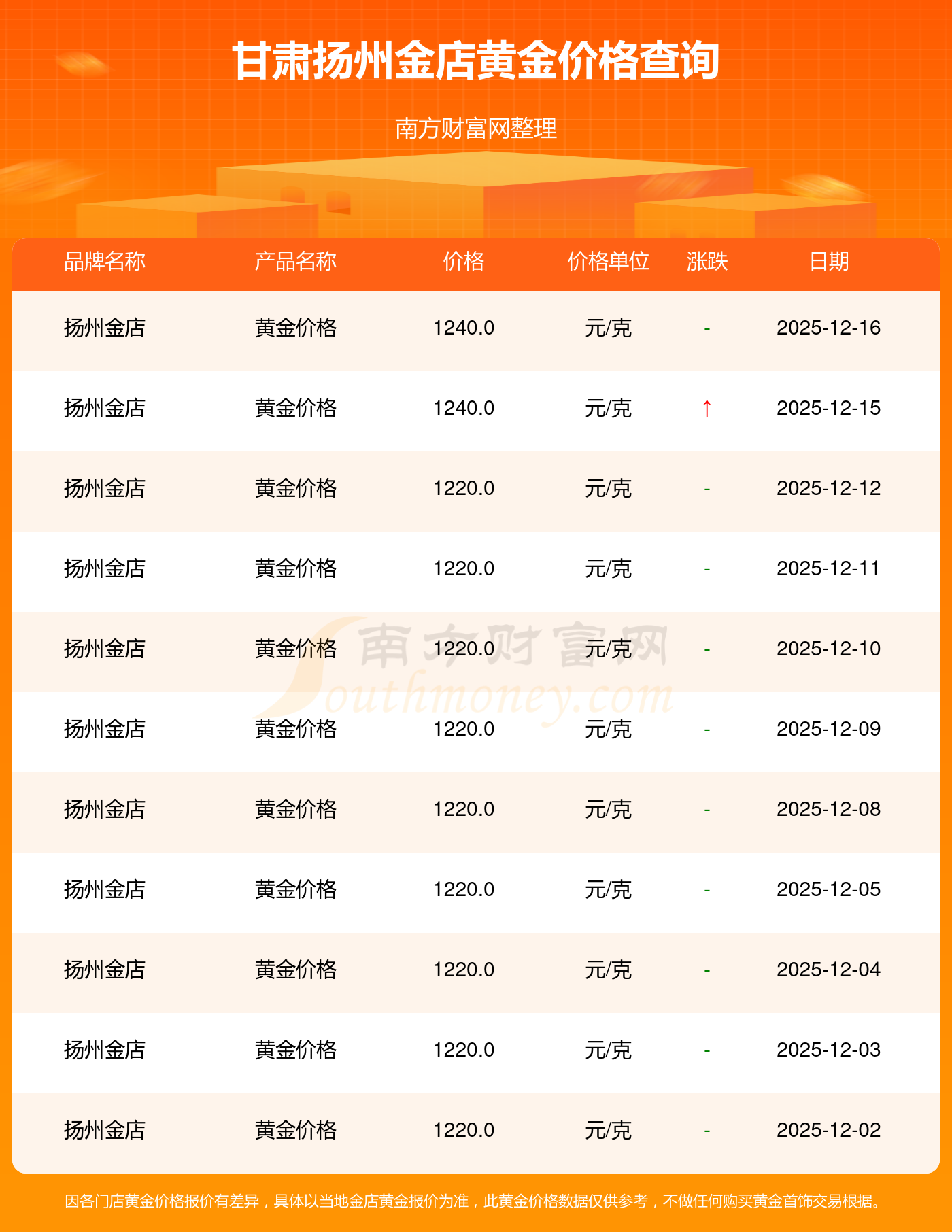 今日甘肅揚(yáng)州金店黃金價(jià)格公布想問問,今日黃金每克的定價(jià)為多少2025年12月16日,甘肅揚(yáng)州金店黃金價(jià)格每克的售賣價(jià)位為1240.0元/克。
