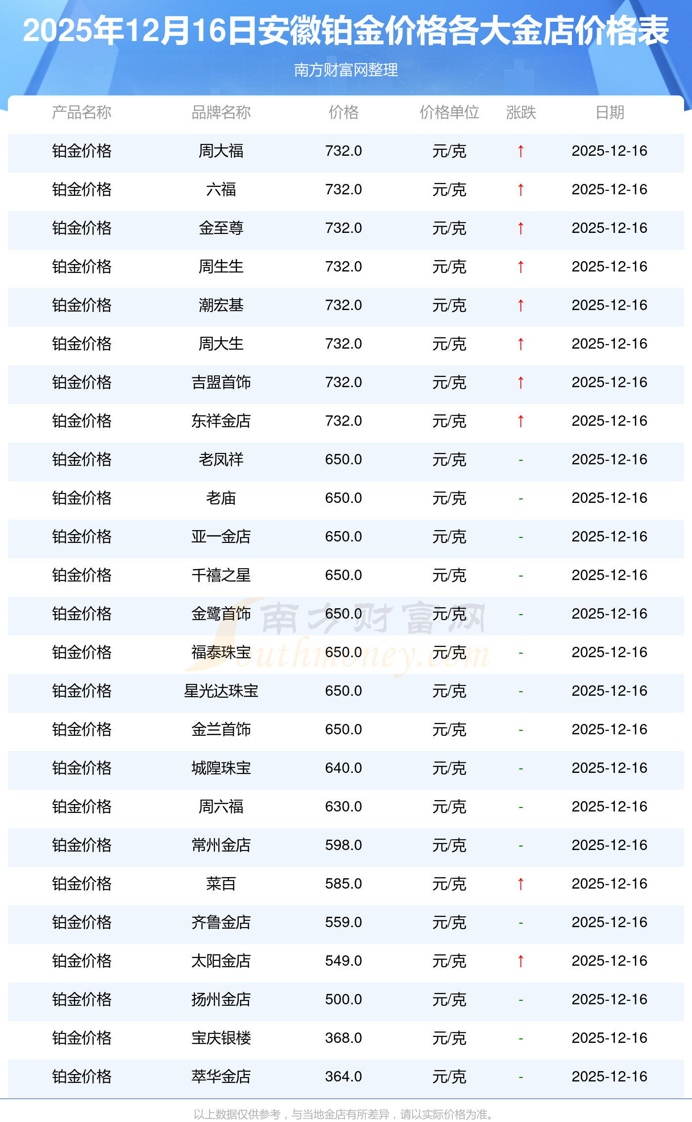 今天是2025年12月16日,安徽周大福、老鳳祥、老廟、周生生、周大福、周大福、周大福、周大福、周大福、周大福、老鳳祥等各大金店品牌鉑金價格最新價格如下:周大福1353.0元/克、老鳳祥1349.0元/克、老廟1352.0元/克、周生生1349.0元/克、周大福732.0元/克、周大福1353.0元/克、周大福47720.0、周大福20950.0、周大福43050.0、周大福1187.0元/克、老鳳祥650.0元/克。