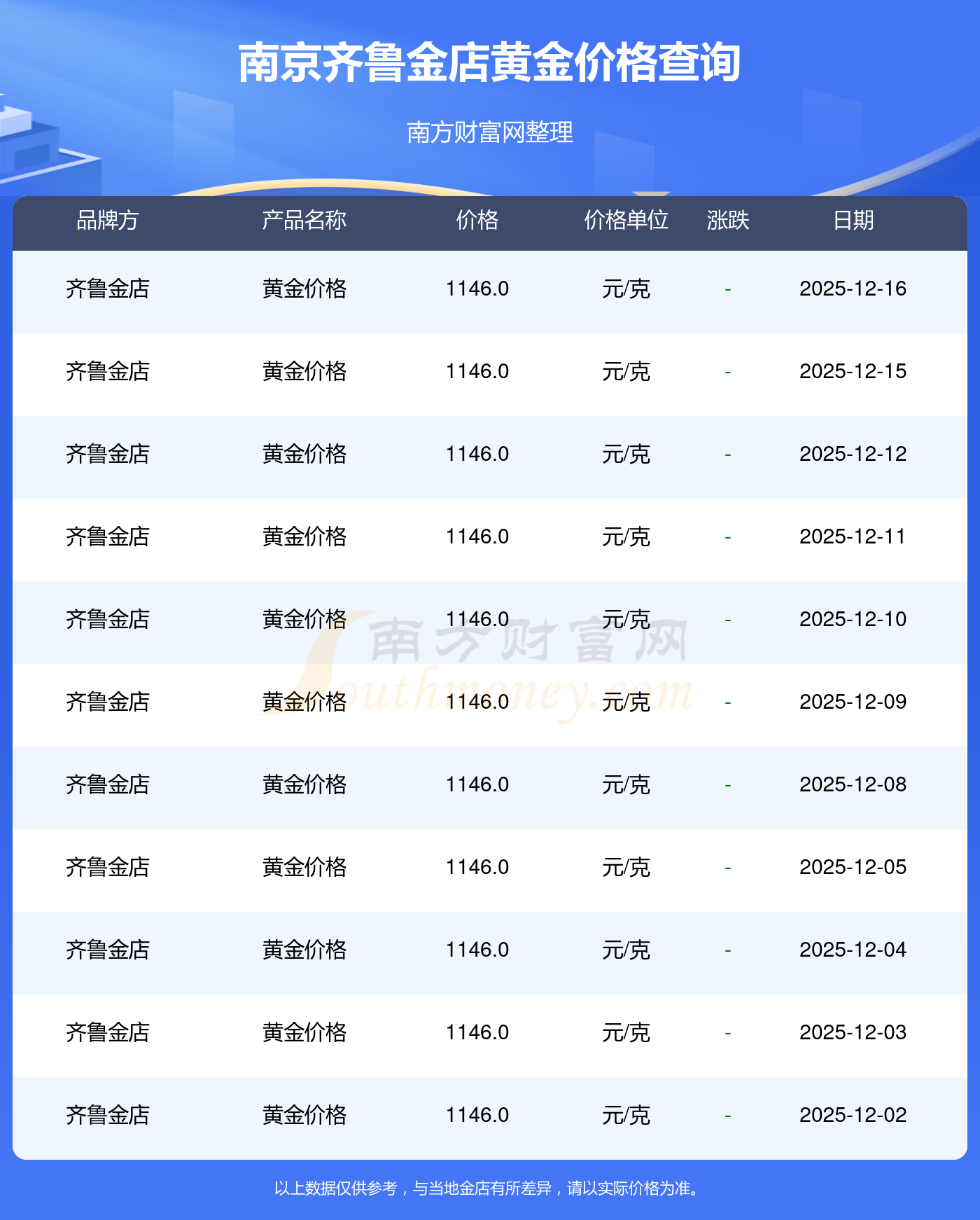1146.0元/克,此乃南京齊魯金店于 2025年12月16日黃金價(jià)格的掛牌價(jià)格。