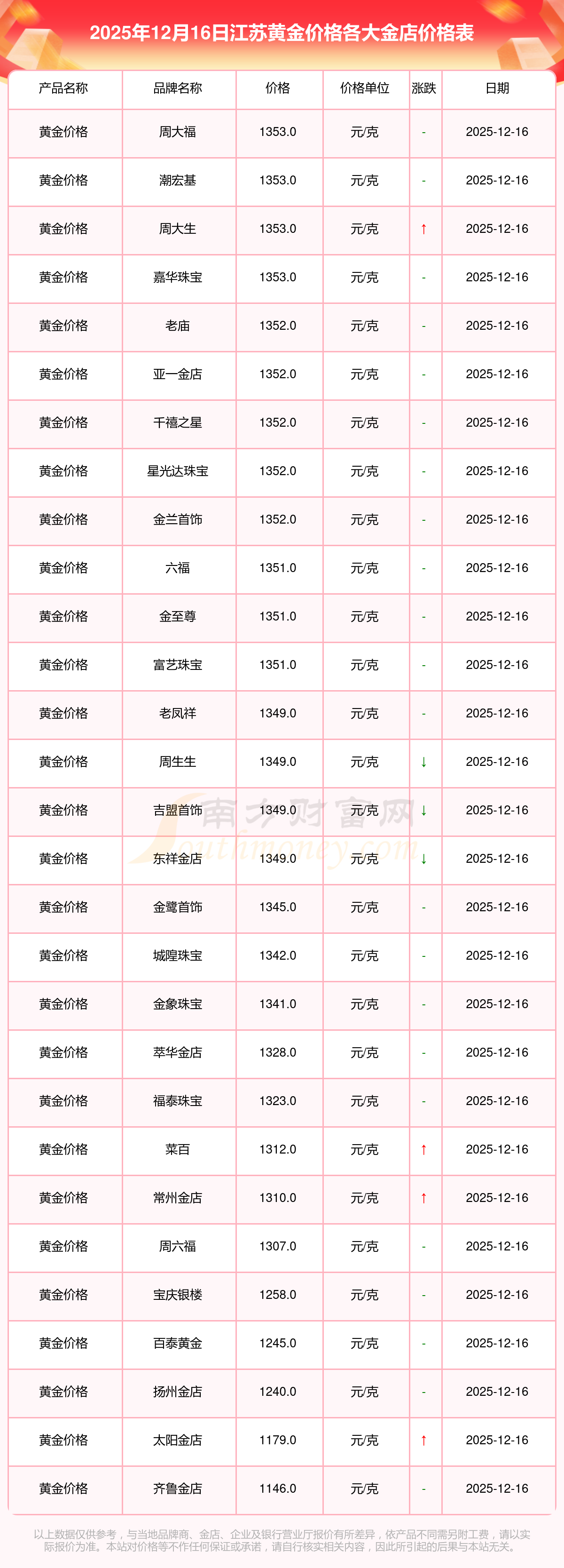 2025年12月16日,江蘇周大福、老鳳祥、老廟、周生生、周大福、周大福、周大福、周大福、周大福、周大福、老鳳祥等各大金店品牌黃金價(jià)格今日價(jià)格如下:周大福1353.0元/克、老鳳祥1349.0元/克、老廟1352.0元/克、周生生1349.0元/克、周大福732.0元/克、周大福1353.0元/克、周大福47720.0、周大福20950.0、周大福43050.0、周大福1187.0元/克、老鳳祥650.0元/克。