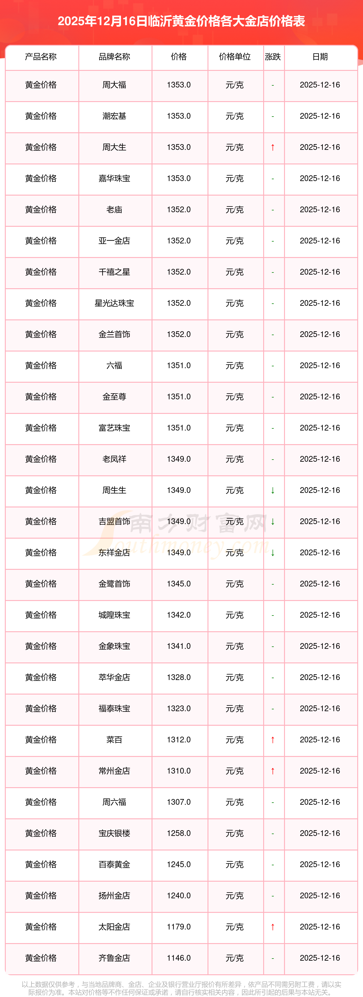 2025年12月16日臨沂周大福、老鳳祥、老廟、周生生、周大福、周大福、周大福、周大福、周大福、周大福、老鳳祥等各大金店品牌黃金價(jià)格最新價(jià)格如下:周大福黃金價(jià)格1353.0元/克,老鳳祥黃金價(jià)格1349.0元/克,老廟黃金價(jià)格1352.0元/克,周生生黃金價(jià)格1349.0元/克,周大福鉑金價(jià)格732.0元/克,周大福飾品金價(jià)(內(nèi)地)1353.0元/克,周大福黃金飾品(香港)47720.0,周大福鉑金價(jià)格(香港)20950.0,周大福金條價(jià)格(香港)43050.0,周大福金條金價(jià)(內(nèi)地)1187.0元/克,老鳳祥鉑金價(jià)格650.0元/克。