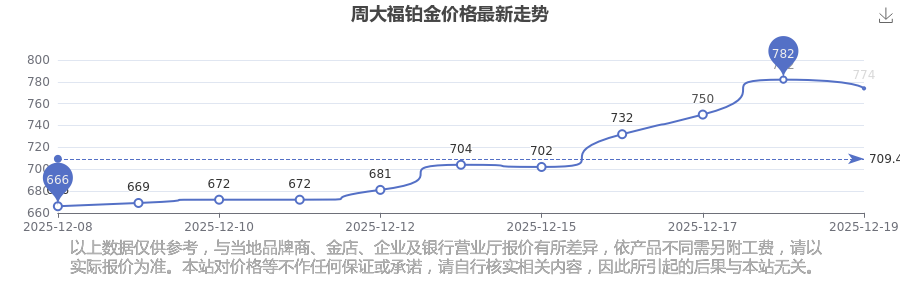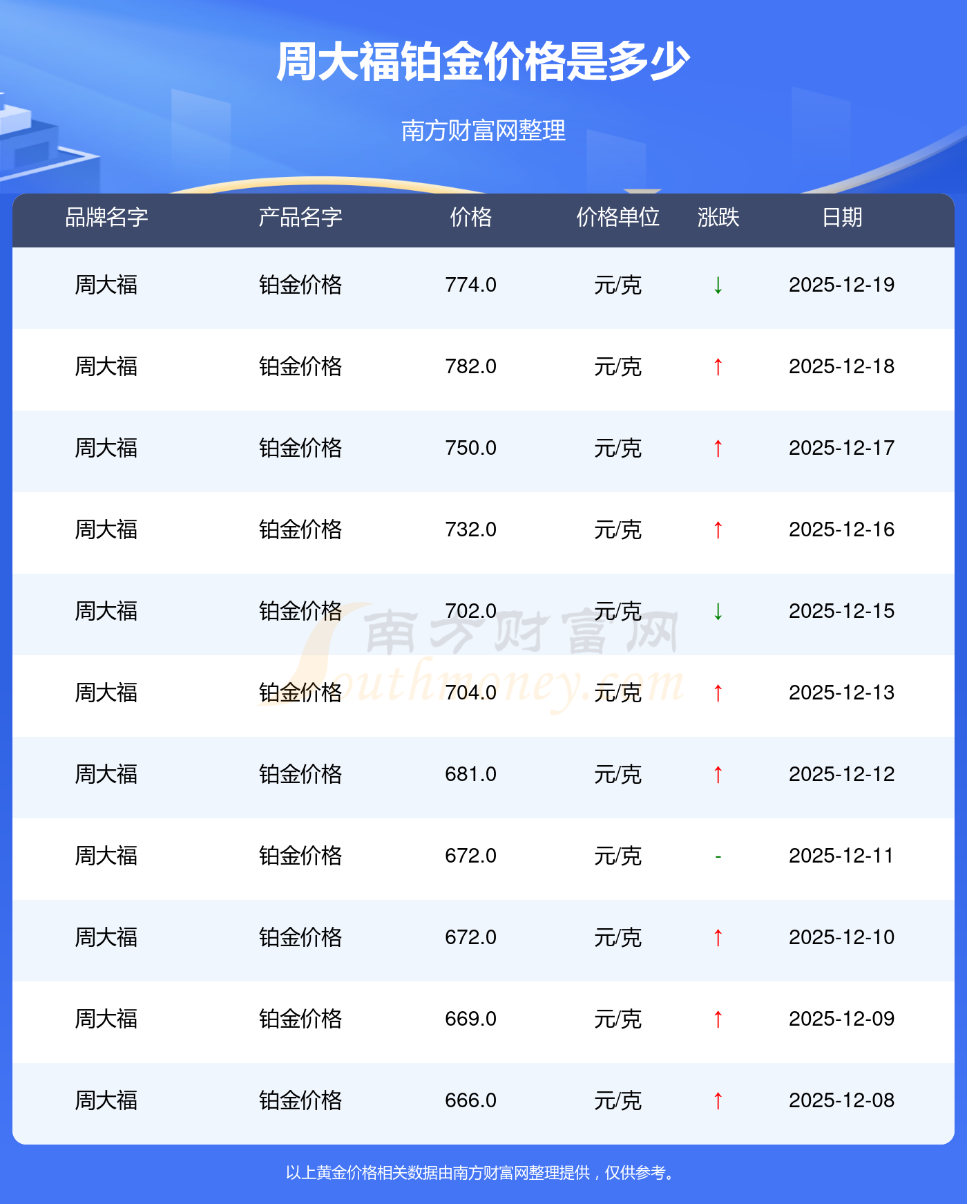 據(jù)了解,今日周大福 鉑金價(jià)格的最新價(jià)格為774.0元/克。