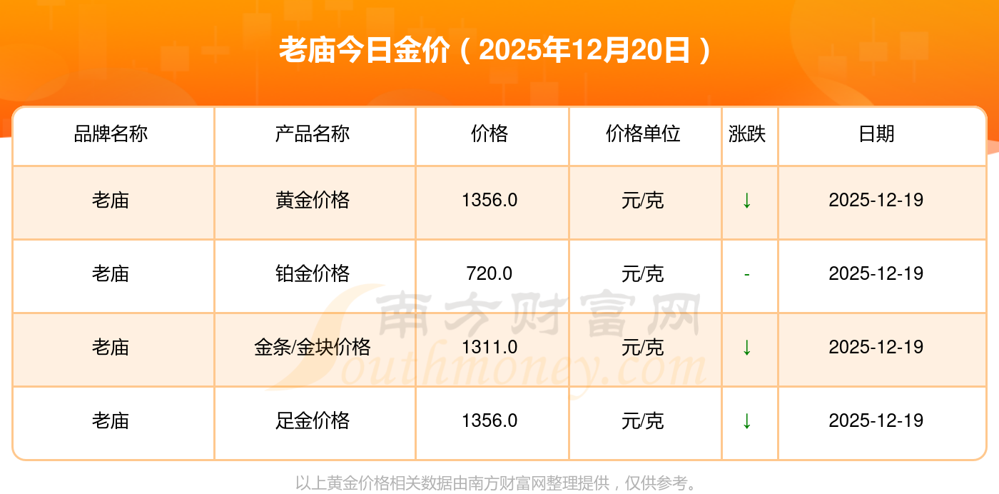 2025年12月20日老廟金價(jià)查詢(xún):黃金價(jià)格1356.0元/克,鉑金價(jià)格720.0元/克,銀條價(jià)格15.1元/克,黃金價(jià)格1356.0元/克,鉑金價(jià)格720.0元/克,金條價(jià)格(內(nèi)地)1207.0元/克,金飾價(jià)格(內(nèi)地)1353.0元/克,黃金飾品(香港)47920.0,鉑金飾品(香港)16330.0,金條金價(jià)(香港)43260.0,投資金條1328.0元/克。