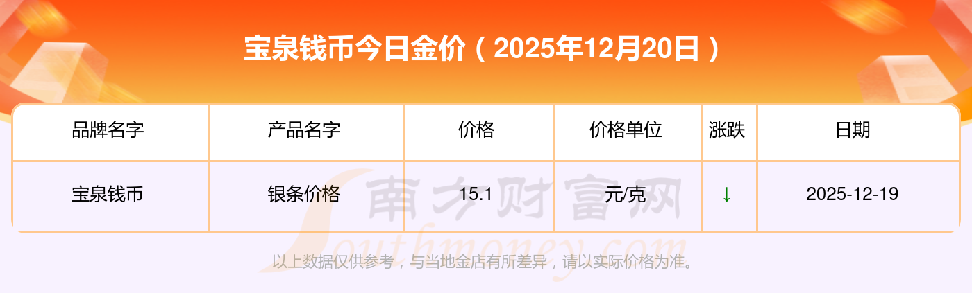 今日寶泉錢幣最新黃金價格查詢(寶泉錢幣黃金首飾多少錢一克2025年12月20日),2025年12月20日寶泉錢幣銀條價格現(xiàn)在每克多少錢?最新寶泉錢幣銀條價格報價公布,一起來看看吧!