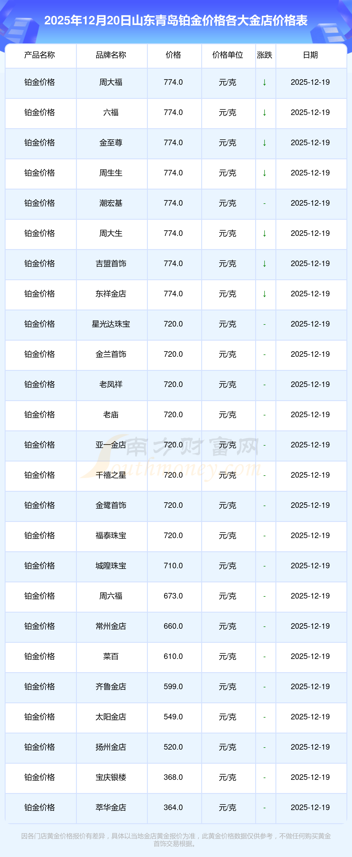 2025年12月20日山東青島各大金店鉑金價(jià)格最新價(jià)格:星光達(dá)珠寶1356.0元/克,星光達(dá)珠寶720.0元/克,寶泉錢(qián)幣15.1元/克,金蘭首飾1356.0元/克,金蘭首飾720.0元/克,謝瑞麟1207.0元/克,謝瑞麟1353.0元/克,謝瑞麟47920.0,謝瑞麟16330.0,謝瑞麟43260.0,金銀街1328.0元/克。