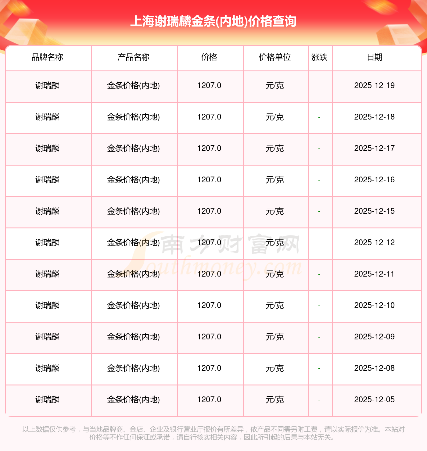 上海謝瑞麟金條價格(內地)在 2025年12月21日,其市場價格為 1207.0元/克。