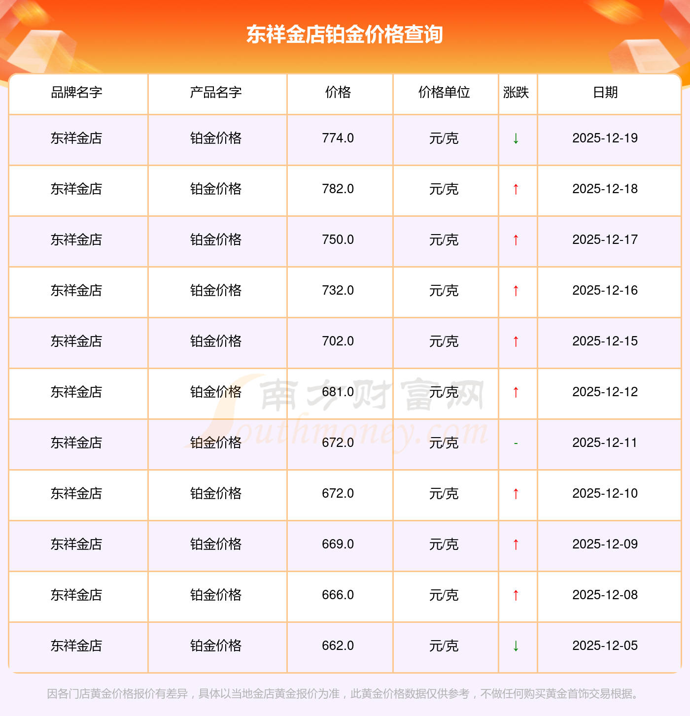 今日東祥金店 鉑金價格最新的市場標(biāo)價為774.0元/克。