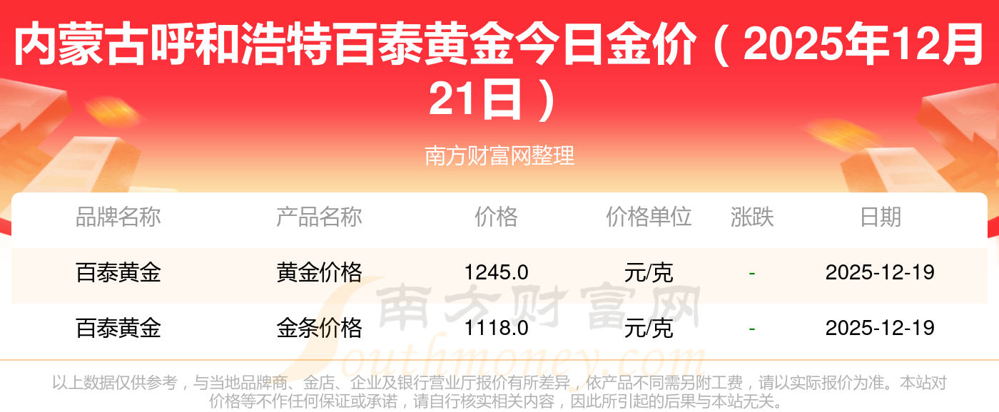 今天黃金價格是多少?現(xiàn)在黃金一克的價錢是怎樣的?2025年12月21日內(nèi)蒙古呼和浩特百泰黃金今日價格:黃金價格1356.0元/克,鉑金價格720.0元/克,銀條價格15.1元/克,黃金價格1356.0元/克,鉑金價格720.0元/克,金條價格(內(nèi)地)1207.0元/克,金飾價格(內(nèi)地)1353.0元/克,黃金飾品(香港)47920.0,鉑金飾品(香港)16330.0,金條金價(香港)43260.0,投資金條1328.0元/克。