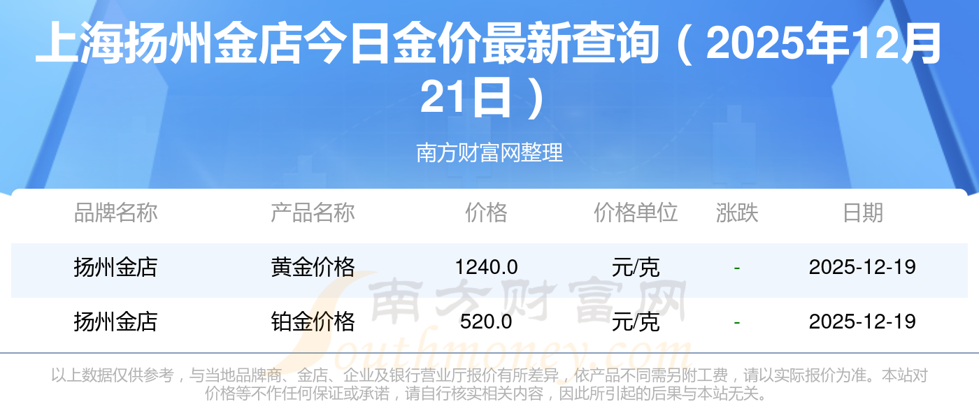 2025年12月21日上海揚州金店金價查詢:黃金價格1356.0元/克,鉑金價格720.0元/克,銀條價格15.1元/克,黃金價格1356.0元/克,鉑金價格720.0元/克,金條價格(內(nèi)地)1207.0元/克,金飾價格(內(nèi)地)1353.0元/克,黃金飾品(香港)47920.0,鉑金飾品(香港)16330.0,金條金價(香港)43260.0,投資金條1328.0元/克。