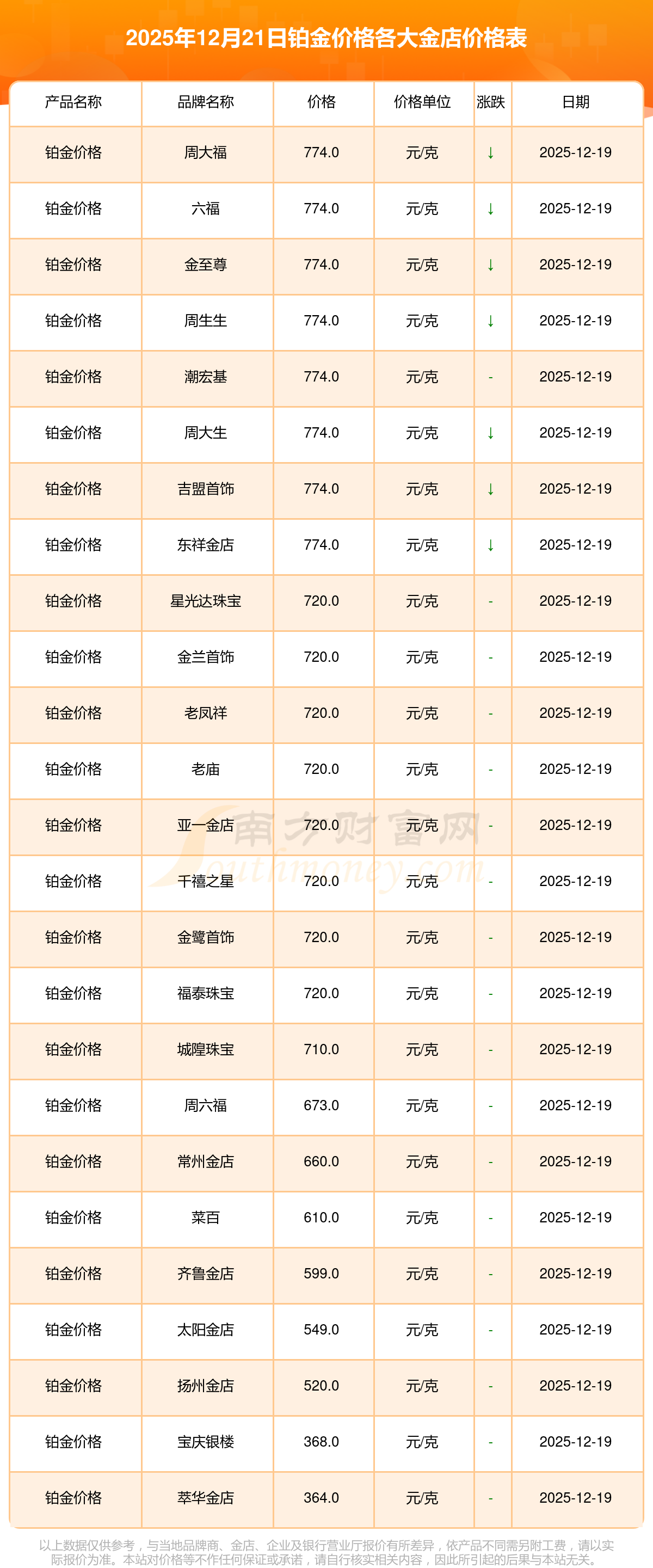 2025年12月21日各大金店鉑金價格最新價格:星光達珠寶1356.0元/克,星光達珠寶720.0元/克,寶泉錢幣15.1元/克,金蘭首飾1356.0元/克,金蘭首飾720.0元/克,謝瑞麟1207.0元/克,謝瑞麟1353.0元/克,謝瑞麟47920.0,謝瑞麟16330.0,謝瑞麟43260.0,金銀街1328.0元/克。
