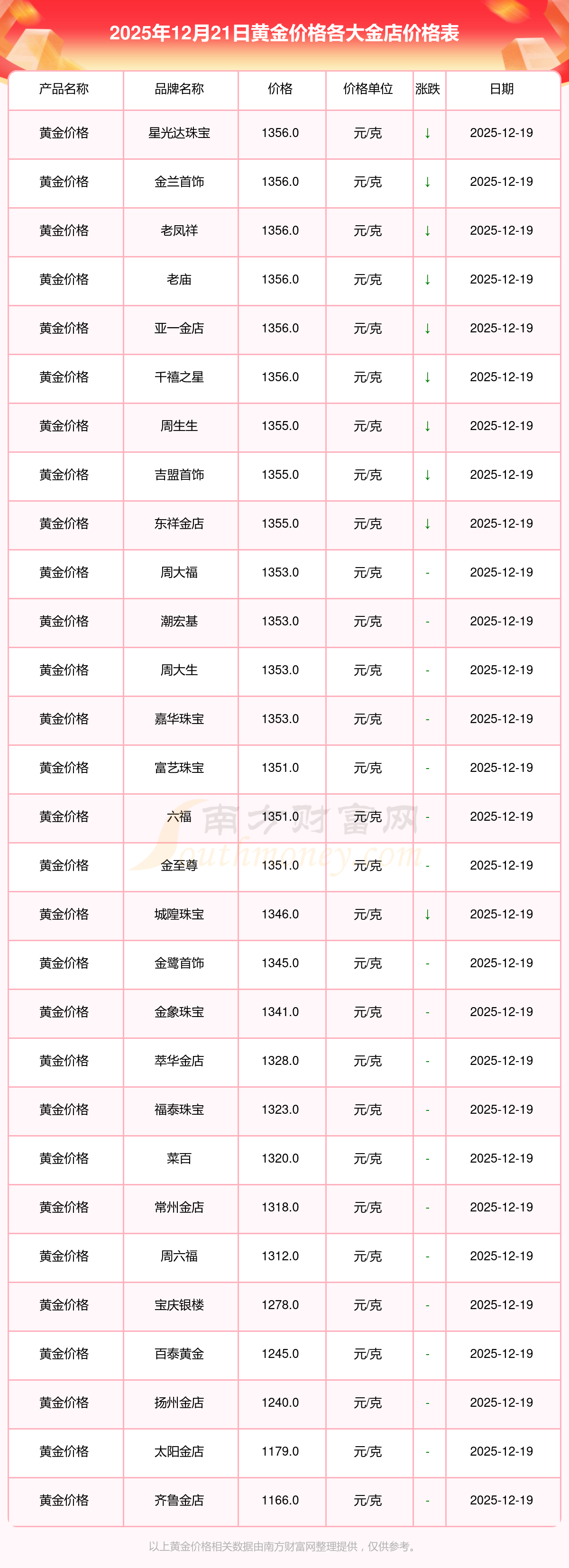 2025年12月21日各大金店黃金價(jià)格最新價(jià)格:星光達(dá)珠寶1356.0元/克,星光達(dá)珠寶720.0元/克,寶泉錢(qián)幣15.1元/克,金蘭首飾1356.0元/克,金蘭首飾720.0元/克,謝瑞麟1207.0元/克,謝瑞麟1353.0元/克,謝瑞麟47920.0,謝瑞麟16330.0,謝瑞麟43260.0,金銀街1328.0元/克。