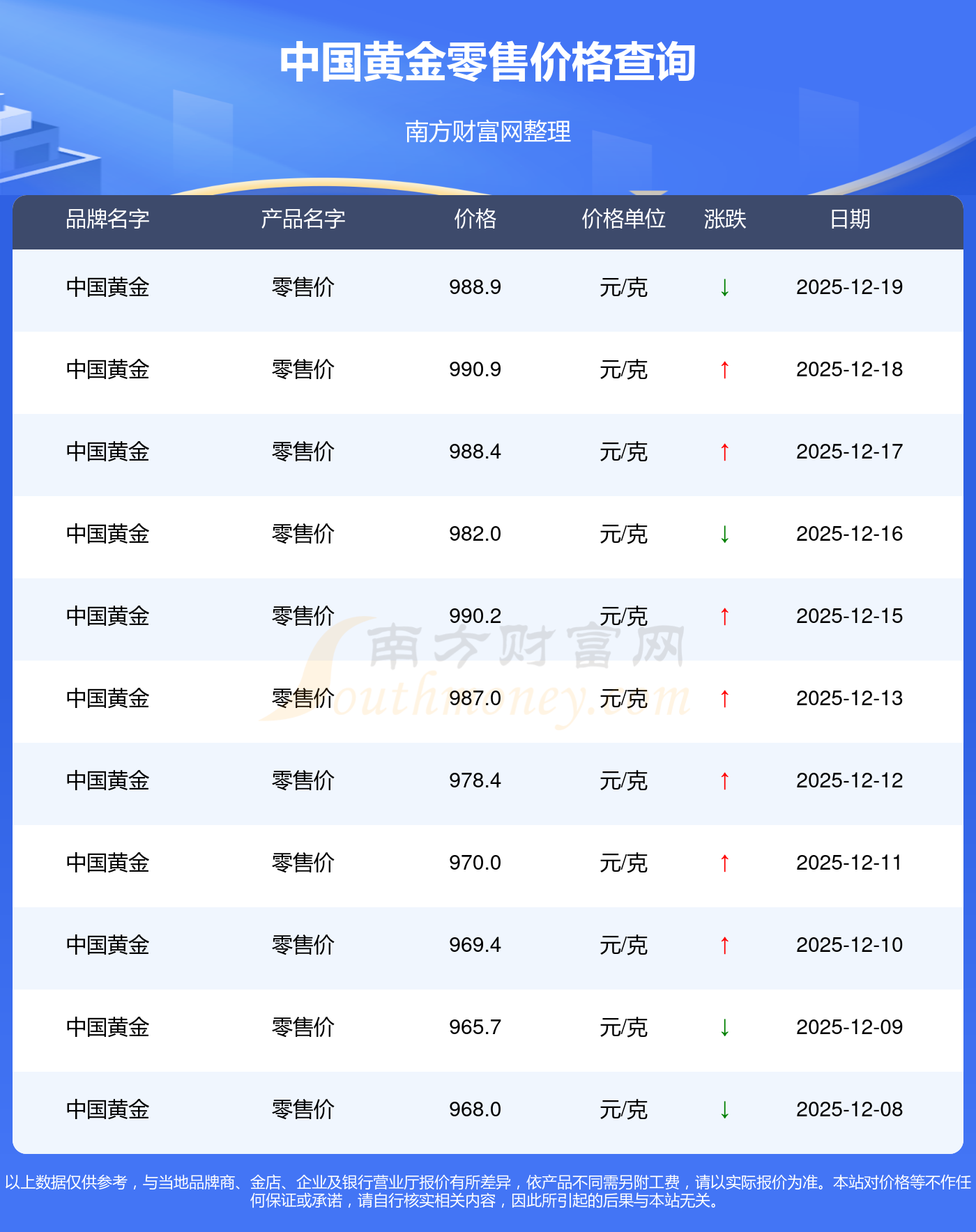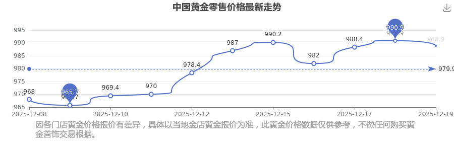今日中國(guó)黃金零售價(jià)格為988.9元/克。