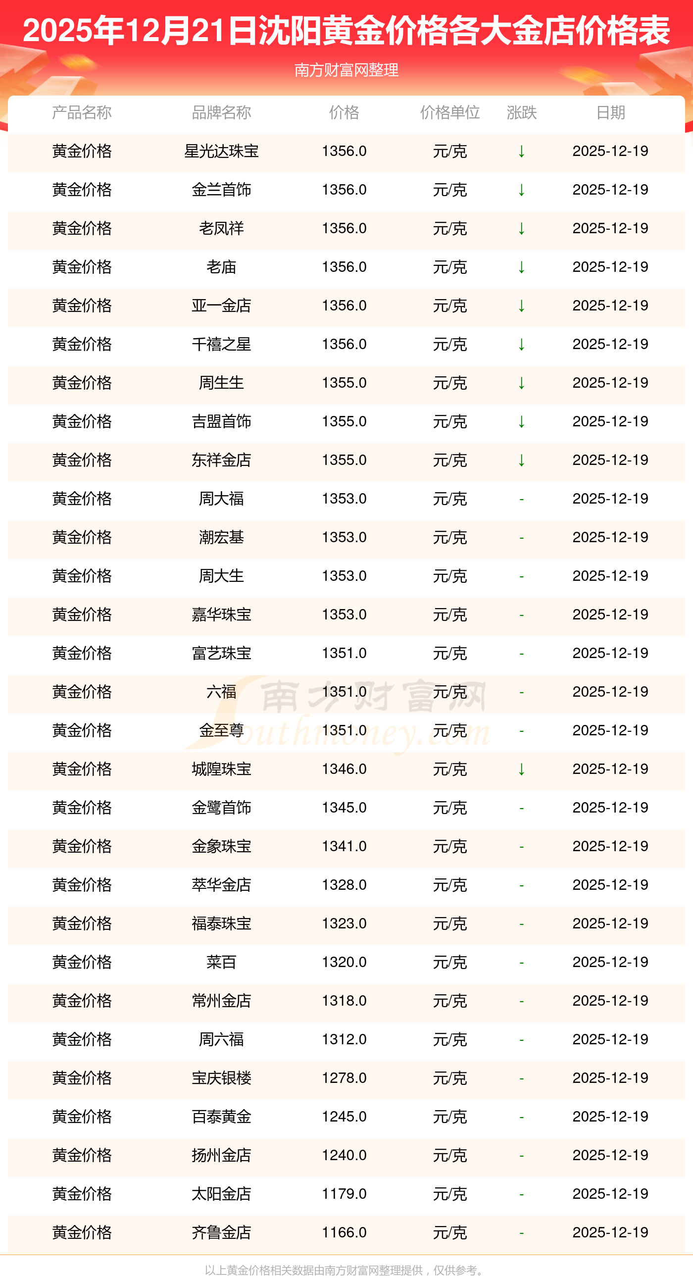 2025年12月21日沈陽(yáng)各大金店黃金價(jià)格最新價(jià)格查詢來(lái)了:星光達(dá)珠寶1356.0元/克,星光達(dá)珠寶720.0元/克,寶泉錢幣15.1元/克,金蘭首飾1356.0元/克,金蘭首飾720.0元/克,謝瑞麟1207.0元/克,謝瑞麟1353.0元/克,謝瑞麟47920.0,謝瑞麟16330.0,謝瑞麟43260.0,金銀街1328.0元/克。