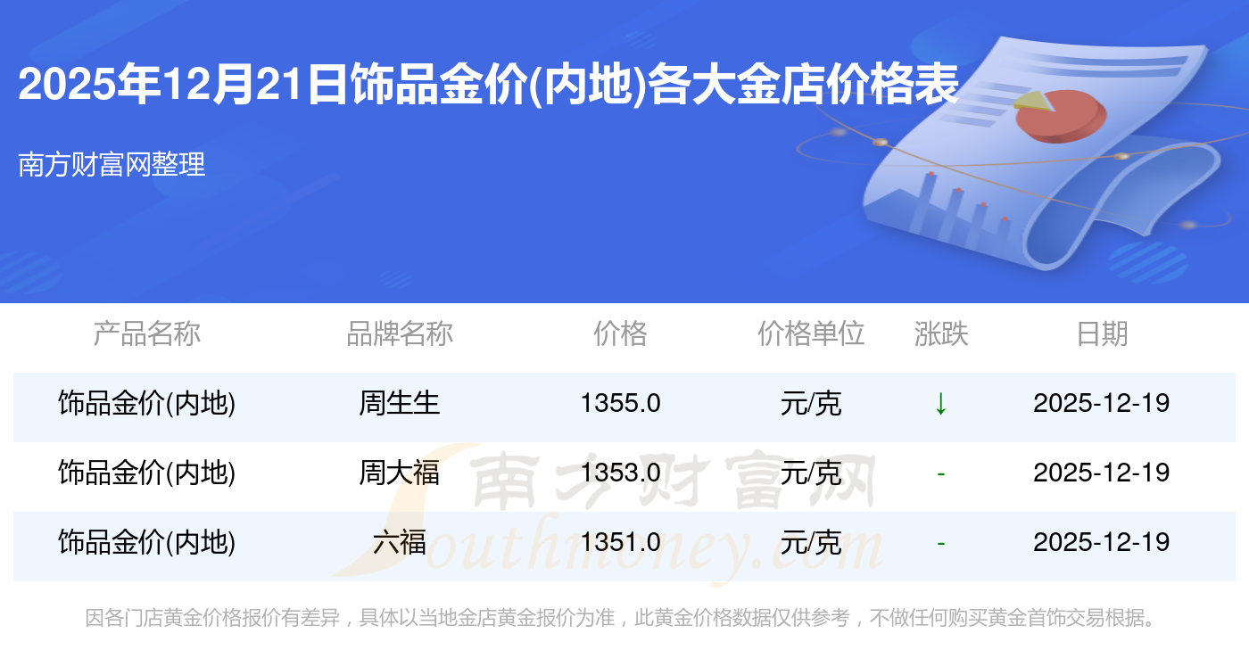 2025年12月21日,星光達珠寶、星光達珠寶、寶泉錢幣、金蘭首飾、金蘭首飾、謝瑞麟、謝瑞麟、謝瑞麟、謝瑞麟、謝瑞麟、金銀街等各大金店品牌飾品金價(內(nèi)地)今日價格如下:星光達珠寶1356.0元/克、星光達珠寶720.0元/克、寶泉錢幣15.1元/克、金蘭首飾1356.0元/克、金蘭首飾720.0元/克、謝瑞麟1207.0元/克、謝瑞麟1353.0元/克、謝瑞麟47920.0、謝瑞麟16330.0、謝瑞麟43260.0、金銀街1328.0元/克。