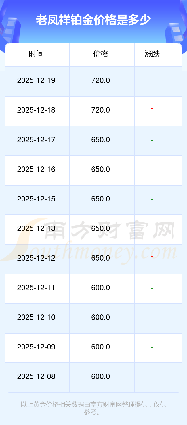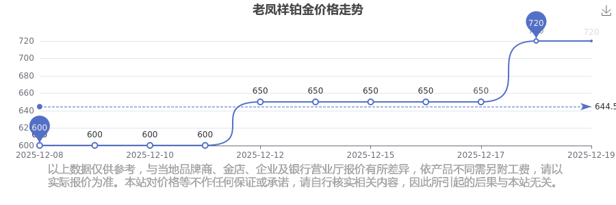 據(jù)了解,老鳳祥今日鉑金價格為720.0元/克。