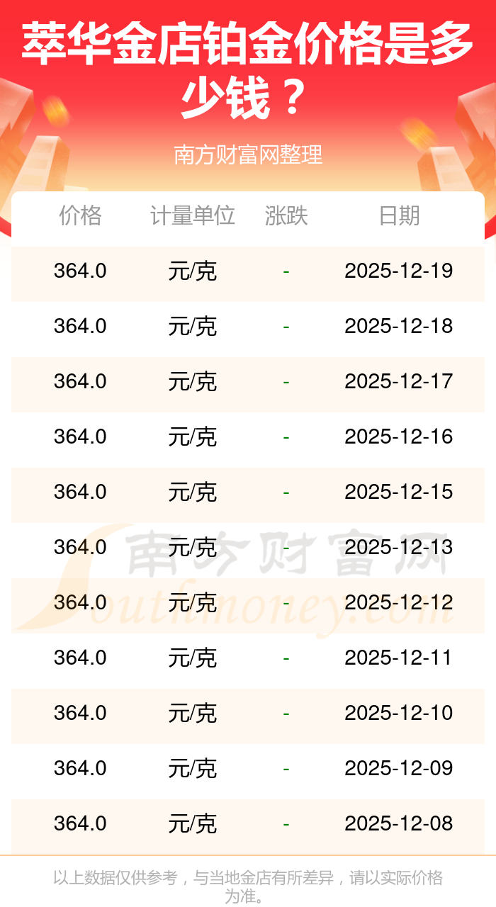 今日(2025年12月21日),萃華金店鉑金價(jià)格最新價(jià)格為364.0元/克。