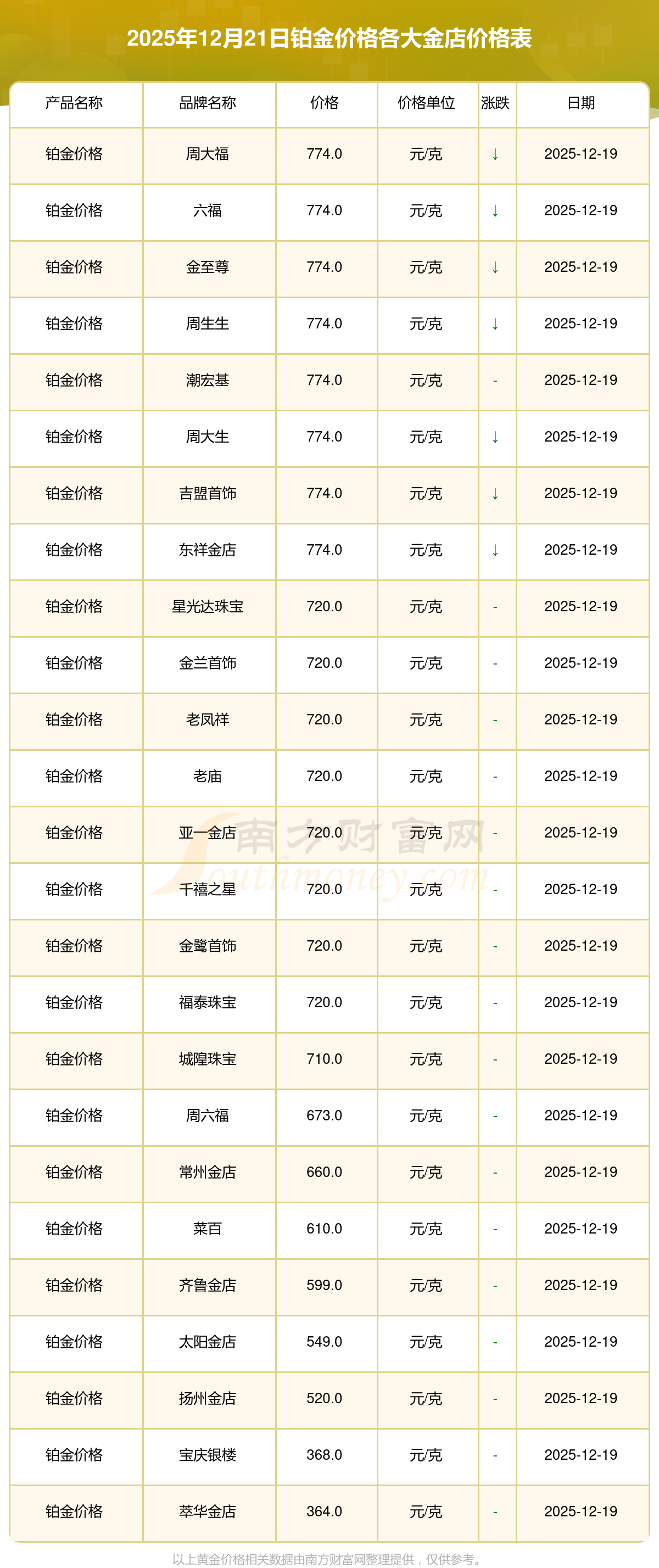 今天是2025年12月21日,星光達(dá)珠寶、星光達(dá)珠寶、寶泉錢幣、金蘭首飾、金蘭首飾、謝瑞麟、謝瑞麟、謝瑞麟、謝瑞麟、謝瑞麟、金銀街等各大金店品牌鉑金價(jià)格最新價(jià)格如下:星光達(dá)珠寶1356.0元/克、星光達(dá)珠寶720.0元/克、寶泉錢幣15.1元/克、金蘭首飾1356.0元/克、金蘭首飾720.0元/克、謝瑞麟1207.0元/克、謝瑞麟1353.0元/克、謝瑞麟47920.0、謝瑞麟16330.0、謝瑞麟43260.0、金銀街1328.0元/克。