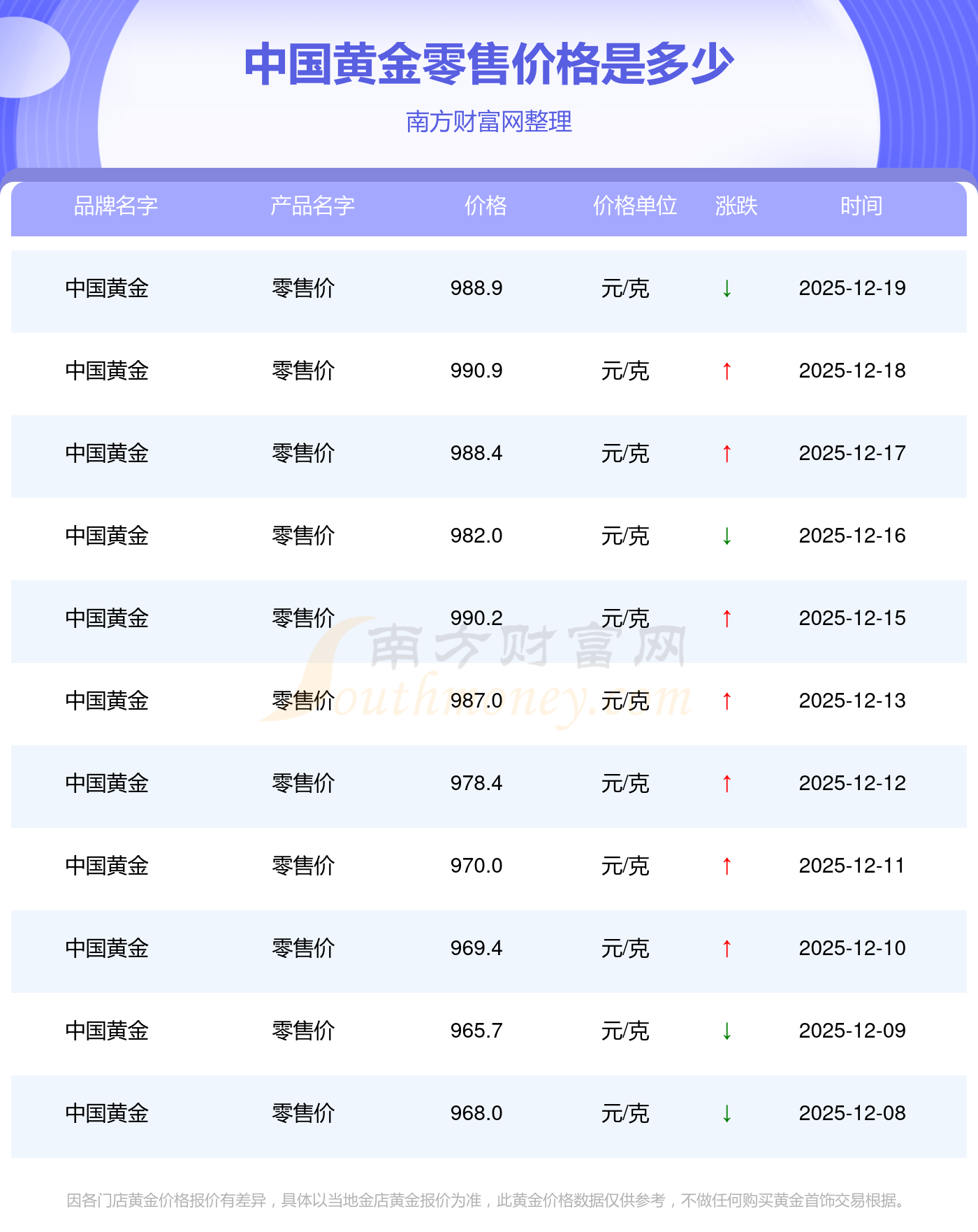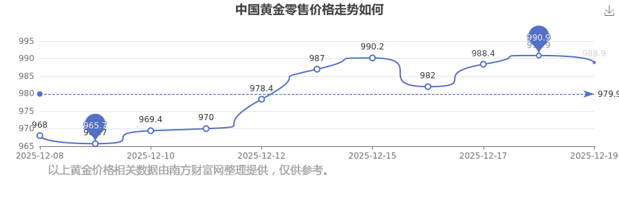 今日中國(guó)黃金零售價(jià)格最新是988.9元/克。