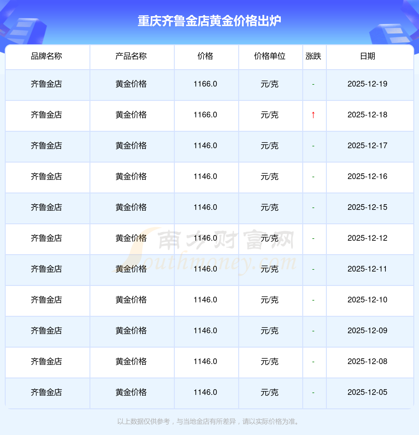 今日重慶齊魯金店黃金價(jià)格公布今日每克黃金的價(jià)值是多少2025年12月21日,今日重慶齊魯金店黃金價(jià)格:1166.0元/克。