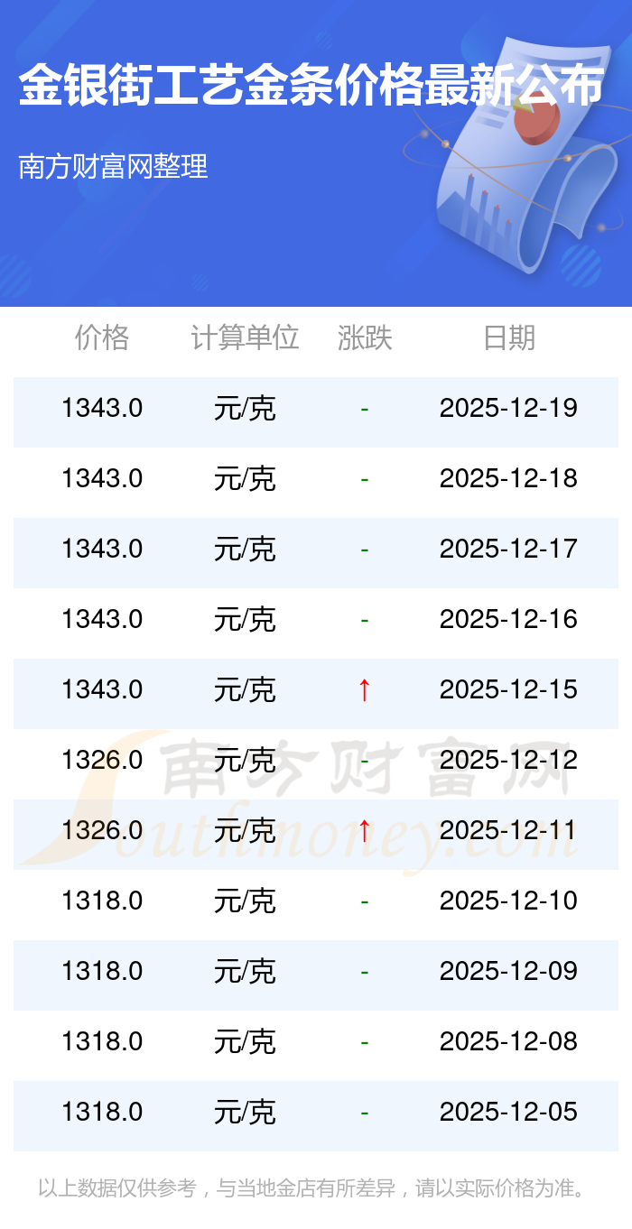 1343.0元/克是金銀街在今日給出的 工藝金條最新價格。