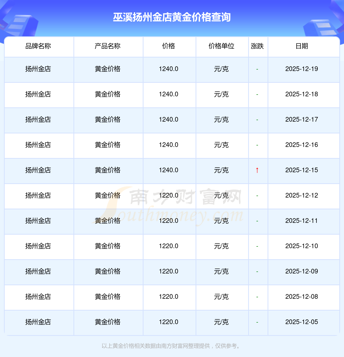 (2025年12月21日)巫溪揚州金店黃金價格現(xiàn)在為1240.0元/克。