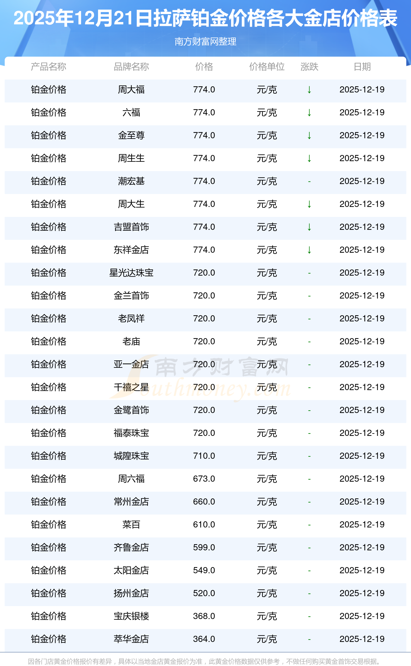 2025年12月21日拉薩各大金店鉑金價(jià)格最新價(jià)格:星光達(dá)珠寶1356.0元/克,星光達(dá)珠寶720.0元/克,寶泉錢(qián)幣15.1元/克,金蘭首飾1356.0元/克,金蘭首飾720.0元/克,謝瑞麟1207.0元/克,謝瑞麟1353.0元/克,謝瑞麟47920.0,謝瑞麟16330.0,謝瑞麟43260.0,金銀街1328.0元/克。