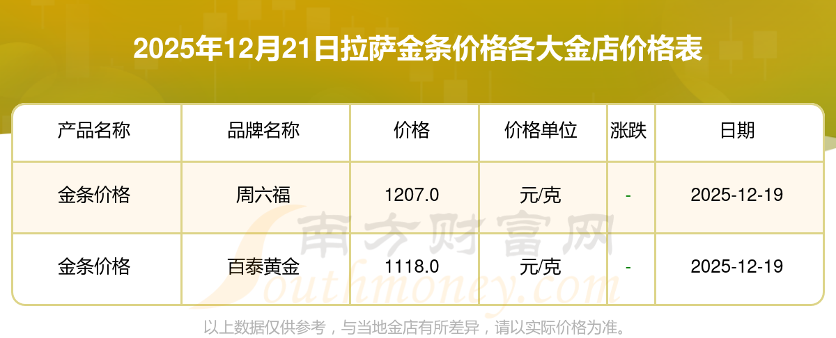 2025年12月21日拉薩星光達(dá)珠寶、星光達(dá)珠寶、寶泉錢幣、金蘭首飾、金蘭首飾、謝瑞麟、謝瑞麟、謝瑞麟、謝瑞麟、謝瑞麟、金銀街等各大金店品牌金條價(jià)格最新價(jià)格行情來了,如下:星光達(dá)珠寶黃金價(jià)格1356.0元/克,星光達(dá)珠寶鉑金價(jià)格720.0元/克,寶泉錢幣銀條價(jià)格15.1元/克,金蘭首飾黃金價(jià)格1356.0元/克,金蘭首飾鉑金價(jià)格720.0元/克,謝瑞麟金條價(jià)格(內(nèi)地)1207.0元/克,謝瑞麟金飾價(jià)格(內(nèi)地)1353.0元/克,謝瑞麟黃金飾品(香港)47920.0,謝瑞麟鉑金飾品(香港)16330.0,謝瑞麟金條金價(jià)(香港)43260.0,金銀街投資金條1328.0元/克。