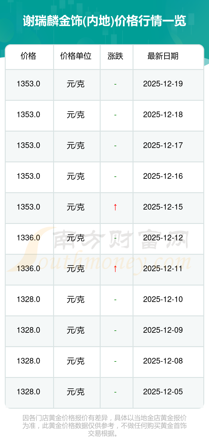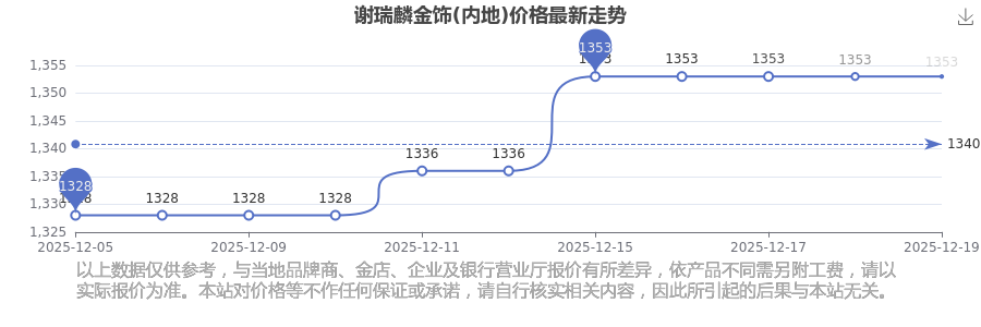 今日謝瑞麟金飾價格(內(nèi)地)最新價格為1353.0元/克。