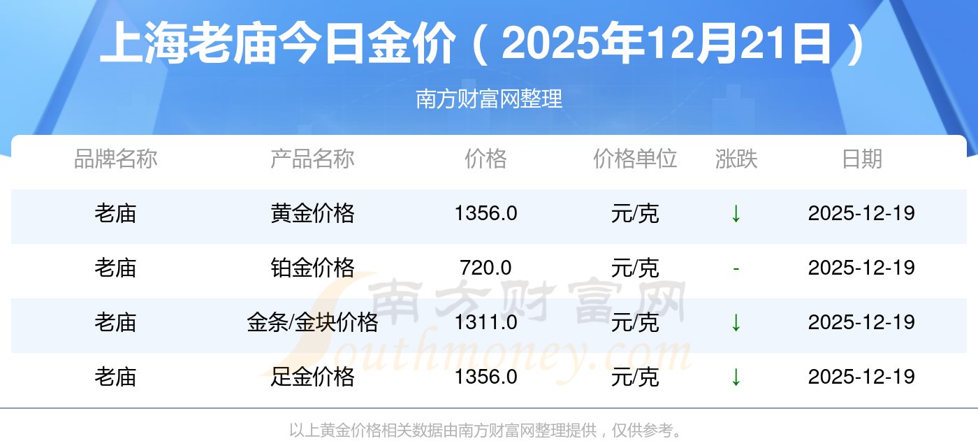 今日黃金價(jià)格查詢(xún)_現(xiàn)在金價(jià)黃金一克多少錢(qián),黃金價(jià)格是多少錢(qián)一克?2025年12月21日上海老廟現(xiàn)在黃金一克要多少錢(qián):黃金價(jià)格1356.0元/克,鉑金價(jià)格720.0元/克,銀條價(jià)格15.1元/克,黃金價(jià)格1356.0元/克,鉑金價(jià)格720.0元/克,金條價(jià)格(內(nèi)地)1207.0元/克,金飾價(jià)格(內(nèi)地)1353.0元/克,黃金飾品(香港)47920.0,鉑金飾品(香港)16330.0,金條金價(jià)(香港)43260.0,投資金條1328.0元/克。