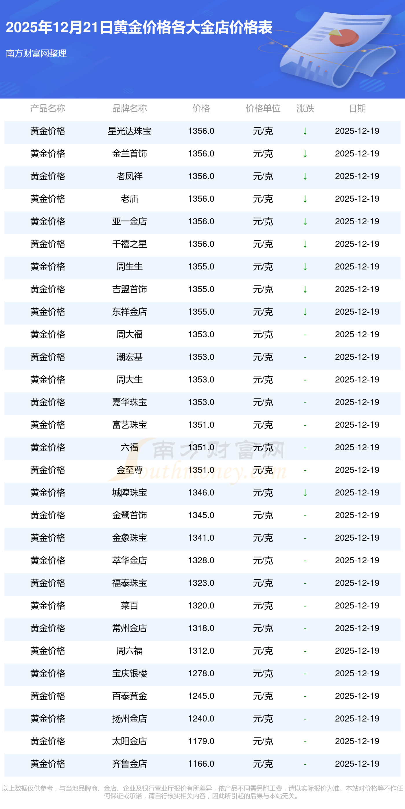2025年12月21日星光達(dá)珠寶、星光達(dá)珠寶、寶泉錢幣、金蘭首飾、金蘭首飾、謝瑞麟、謝瑞麟、謝瑞麟、謝瑞麟、謝瑞麟、金銀街等各大金店品牌黃金價(jià)格最新價(jià)格如下:星光達(dá)珠寶黃金價(jià)格1356.0元/克,星光達(dá)珠寶鉑金價(jià)格720.0元/克,寶泉錢幣銀條價(jià)格15.1元/克,金蘭首飾黃金價(jià)格1356.0元/克,金蘭首飾鉑金價(jià)格720.0元/克,謝瑞麟金條價(jià)格(內(nèi)地)1207.0元/克,謝瑞麟金飾價(jià)格(內(nèi)地)1353.0元/克,謝瑞麟黃金飾品(香港)47920.0,謝瑞麟鉑金飾品(香港)16330.0,謝瑞麟金條金價(jià)(香港)43260.0,金銀街投資金條1328.0元/克。