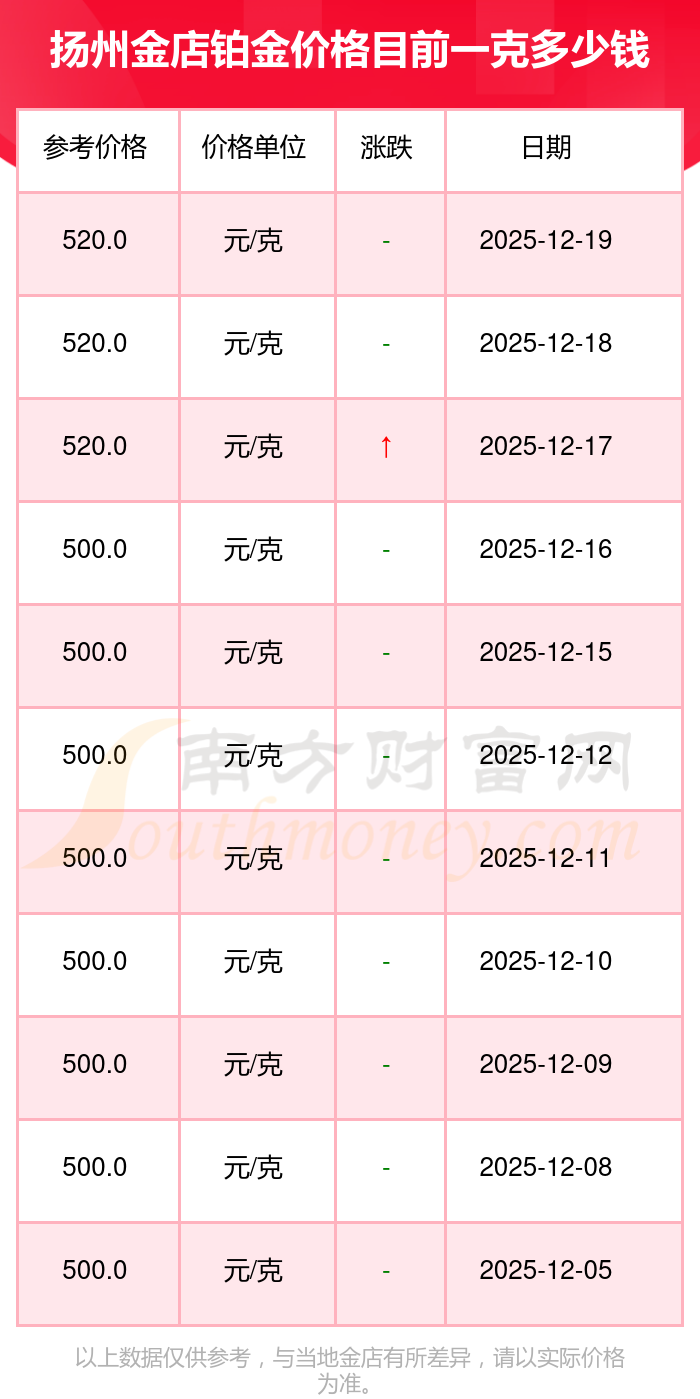 今日(2025年12月21日)揚(yáng)州金店鉑金價(jià)格的價(jià)格為520.0元/克。