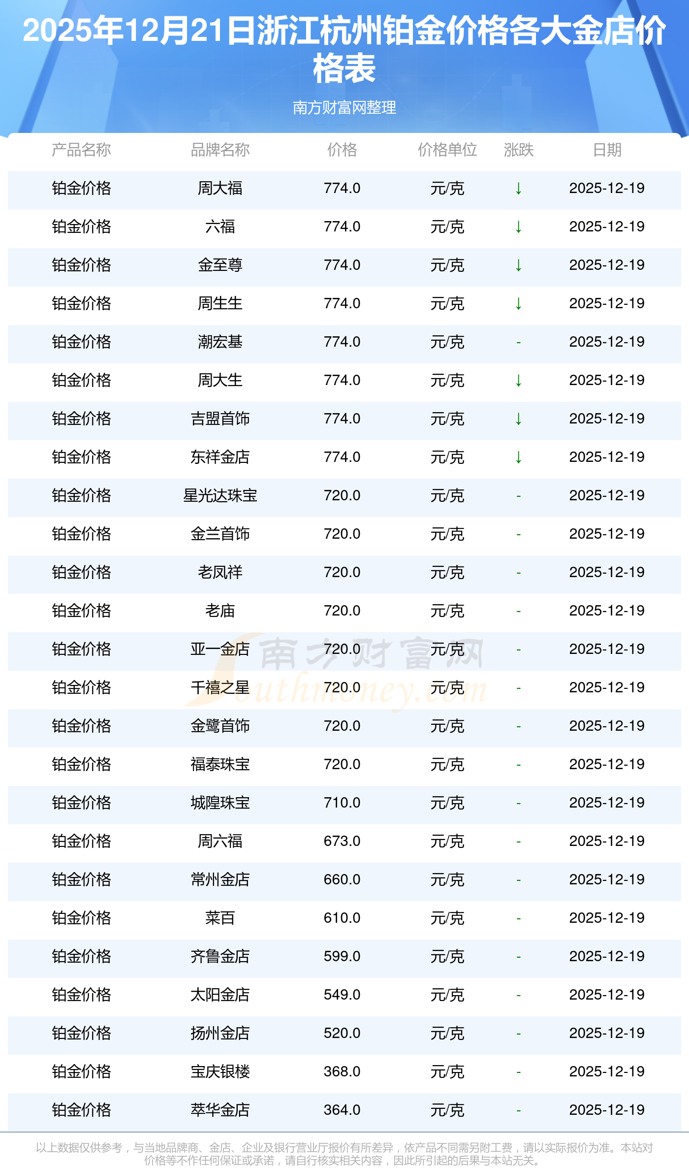2025年12月21日浙江杭州各金店鉑金價格是多少錢一克?