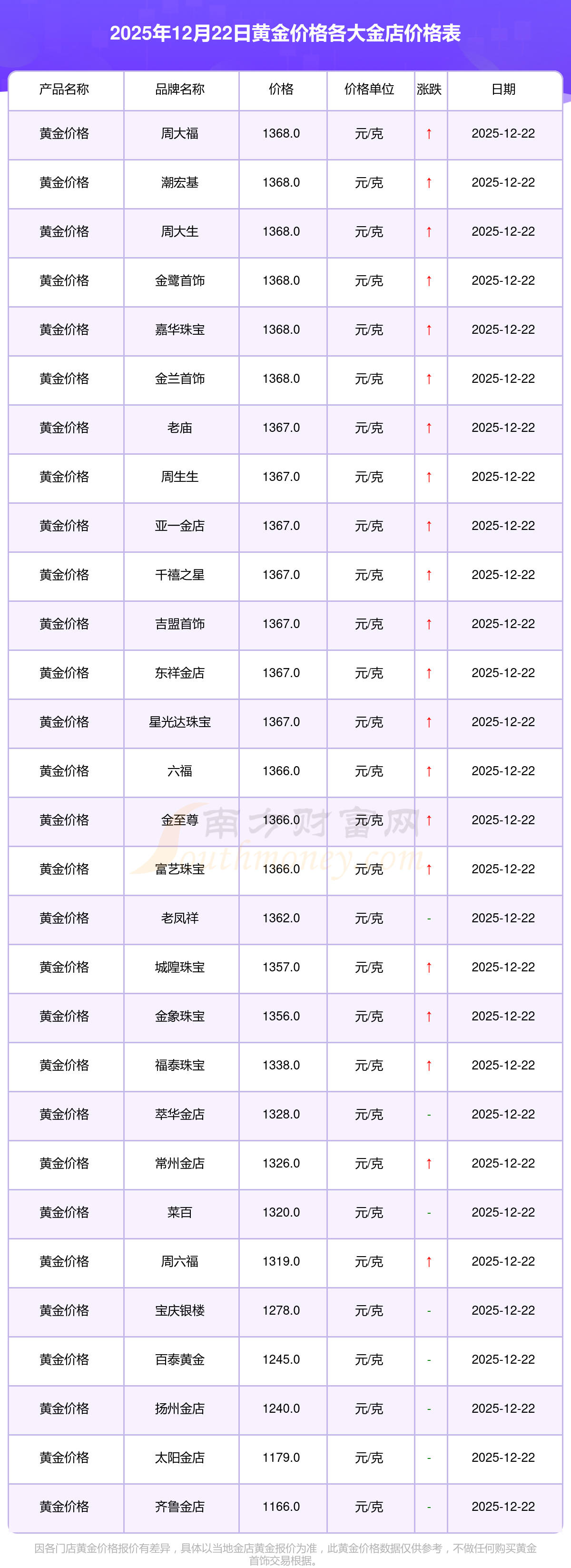 2025年12月22日周大福、老鳳祥、老廟、周生生、周大福、周大福、周大福、周大福、周大福、周大福、老鳳祥等各大金店品牌黃金價(jià)格最新價(jià)格如下:周大福黃金價(jià)格1368.0元/克,老鳳祥黃金價(jià)格1362.0元/克,老廟黃金價(jià)格1367.0元/克,周生生黃金價(jià)格1367.0元/克,周大福鉑金價(jià)格803.0元/克,周大福飾品金價(jià)(內(nèi)地)1368.0元/克,周大福黃金飾品(香港)48400.0,周大福鉑金價(jià)格(香港)23410.0,周大福金條價(jià)格(香港)43660.0,周大福金條金價(jià)(內(nèi)地)1199.0元/克,老鳳祥鉑金價(jià)格720.0元/克。