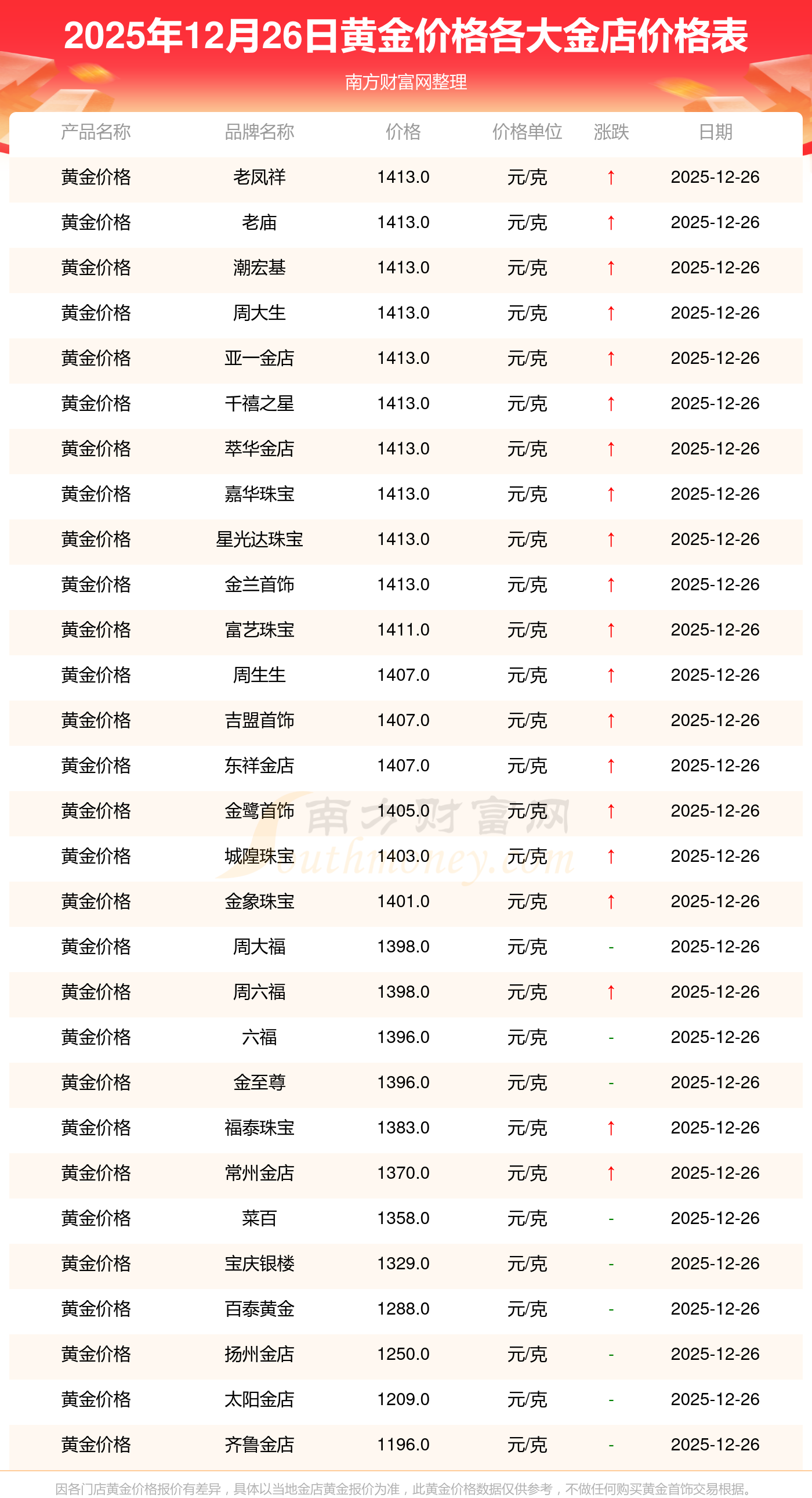 2025年12月26日,周大福、老鳳祥、老廟、周生生、周大福、周大福、周大福、周大福、周大福、周大福、老鳳祥等各大金店品牌黃金價(jià)格今日價(jià)格如下:周大福1398.0元/克、老鳳祥1413.0元/克、老廟1413.0元/克、周生生1407.0元/克、周大福925.0元/克、周大福1413.0元/克、周大福50280.0、周大福27110.0、周大福45210.0、周大福1239.0元/克、老鳳祥880.0元/克。
