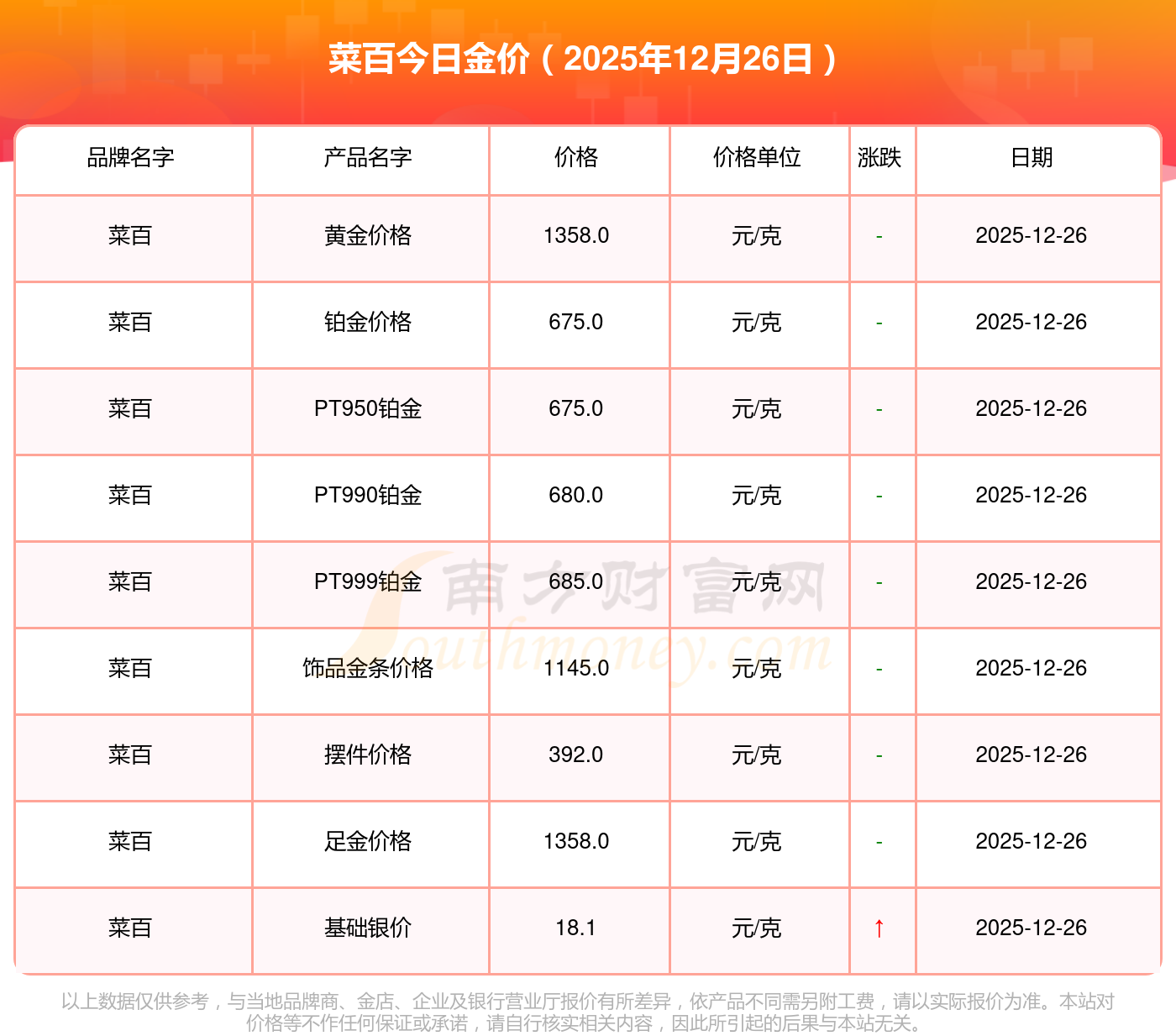 因各門店黃金價(jià)格報(bào)價(jià)有差異,具體以當(dāng)?shù)亟鸬挈S金報(bào)價(jià)為準(zhǔn),此黃金價(jià)格數(shù)據(jù)僅供參考,不做任何購買黃金首飾交易根據(jù)。