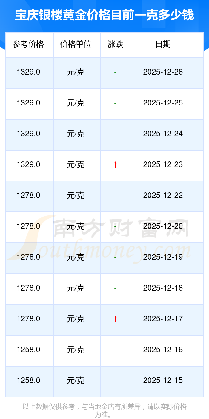 2025年12月26日寶慶銀樓黃金價格查詢:1329.0元/克。