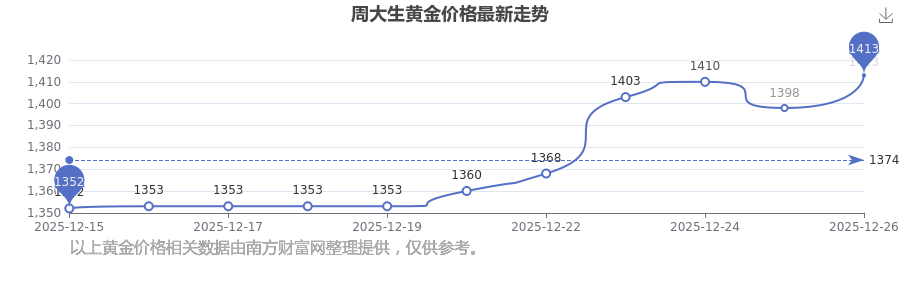 今日黃金價格是怎樣的?當下黃金一克要賣多少錢?黃金是一種優(yōu)良的導電導熱材料,具有良好的導熱特性。黃金常用于電子工業(yè)中的特殊電路設計,因其化學穩(wěn)定性高、抗氧化性強,可制作高精度電子元件。2025年12月26日周大生黃金價格是1413.0元/克。