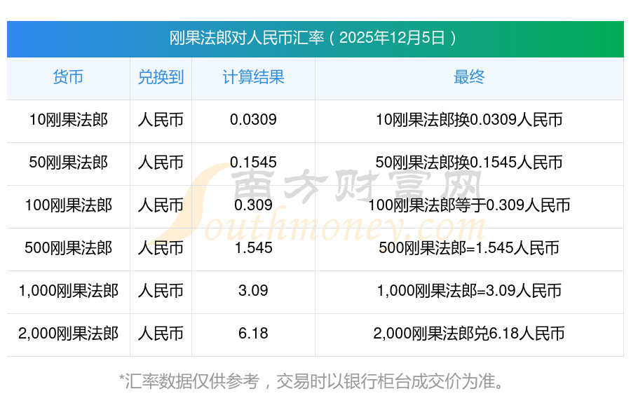 匯率實時變化!7剛果法郎兌換人民幣匯率表(2025年12月5日)