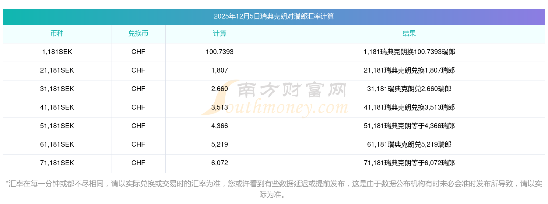 南方財(cái)富網(wǎng)為您提供瑞典克朗換成瑞郎匯率最新價(jià)格詳情。