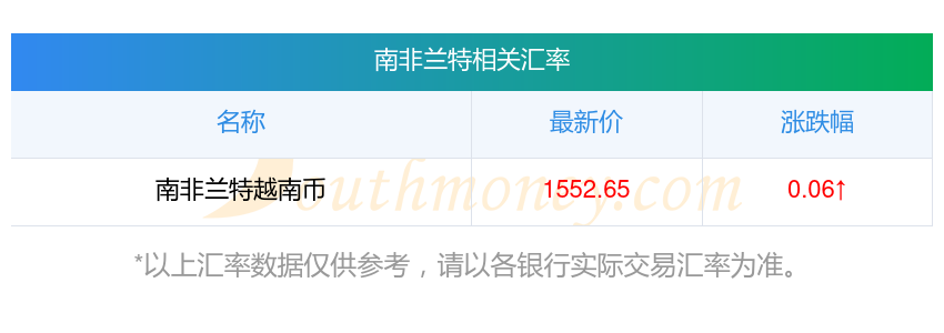 2025年12月5日南非蘭特兌換越南幣最新匯率:1552.650000,今開(kāi):1552.0100,昨收:1551.6600,最高:1555.5400,最低:1551.2600。