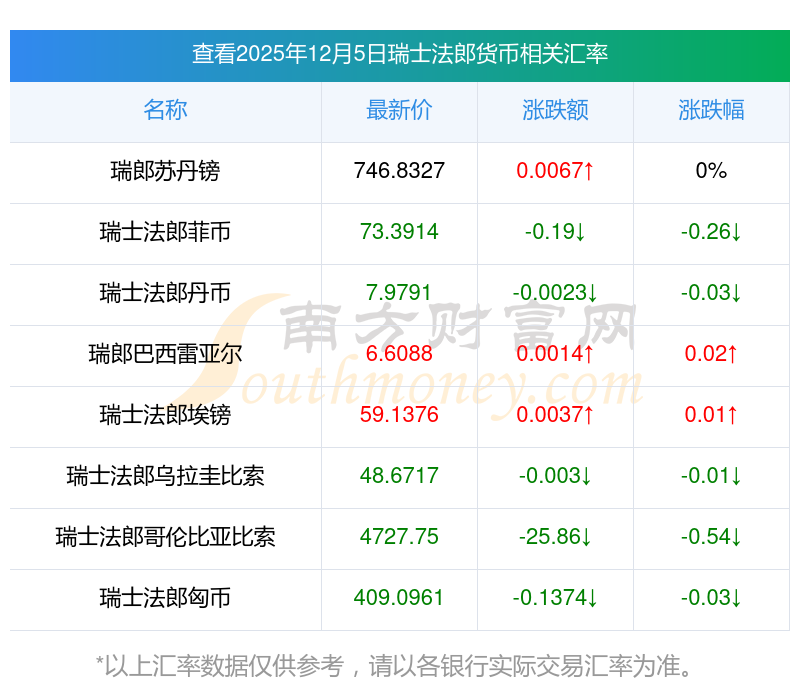 2025年12月5日瑞士法郎相關(guān)匯率查詢